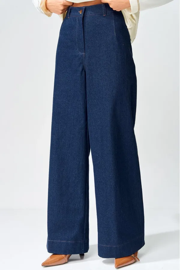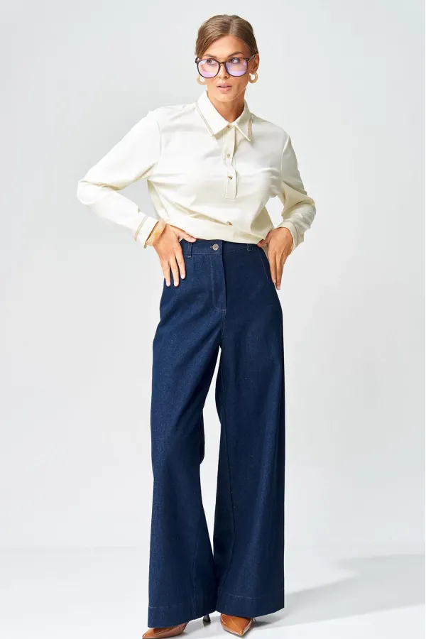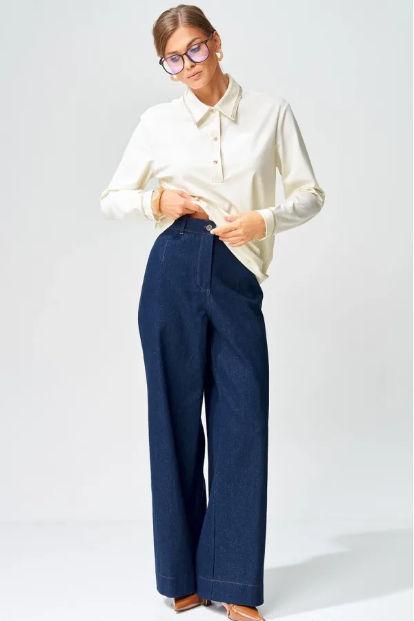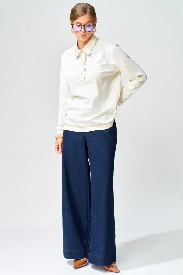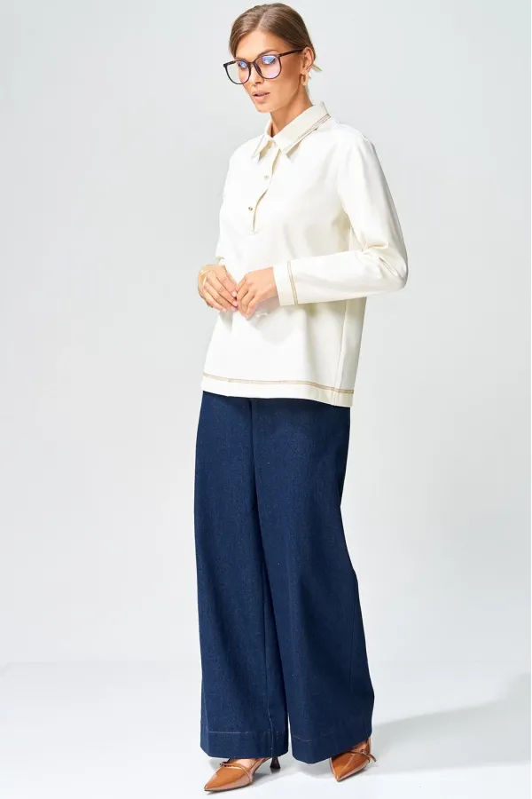 Джемпер прямого силуэта с воротником поло из плотной хлопковой ткани двухнитка. Рукав втачной одношовный. По низу изделия, по низу рукава и по воротнику проложена отделочная строчка. Брюки расширеные книзу на притачном п... Читать далее...