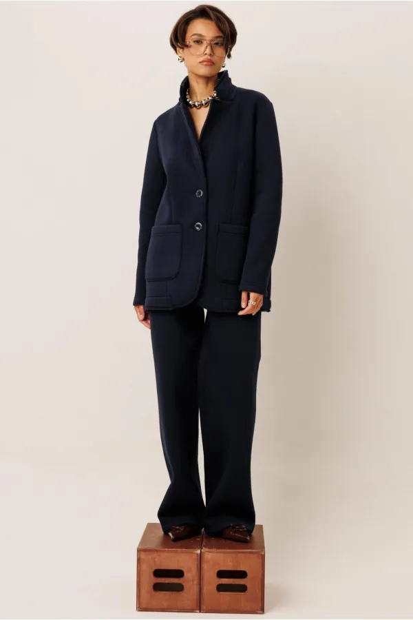Жакет прямого силуэта с пиджачным воротником, имеет удобные накладные карманы и застежку на 2 пуговицы. На левом лацкане вышивка-логотип в цвет ткани. Низ и борта имеют открытые края (эффект необработанного шва), укреплены дополнительной строчкой. Жакет без подкладки.