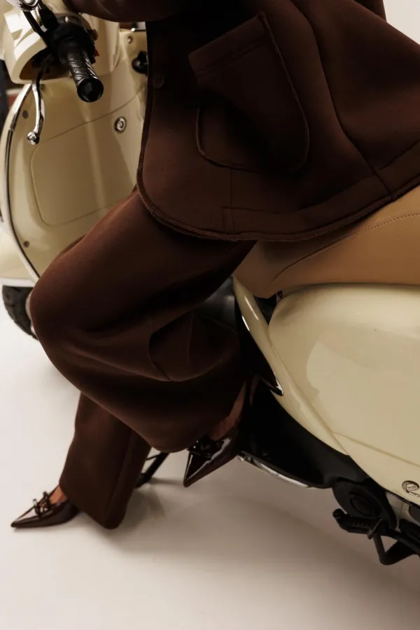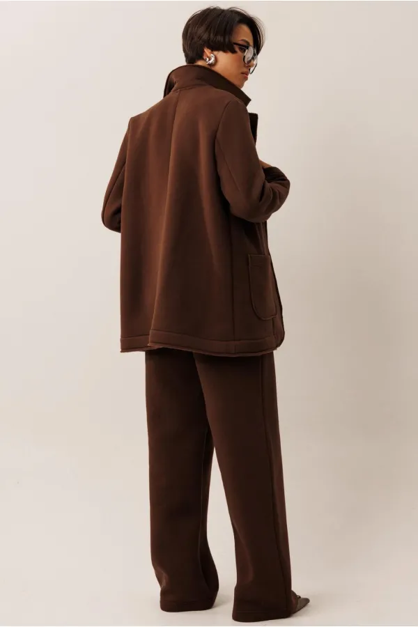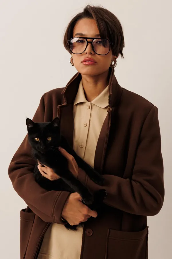 Жакет прямого силуэта с пиджачным воротником, имеет удобные накладные карманы и застежку на 2 пуговицы. На левом лацкане вышивка-логотип в цвет ткани. Низ и борта имеют открытые края (эффект необработанного шва), укреплены дополнительной строчкой. Жакет без подкладки.