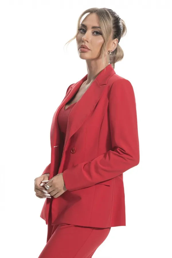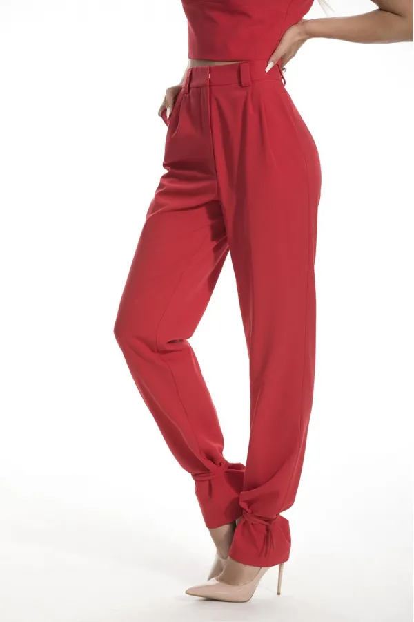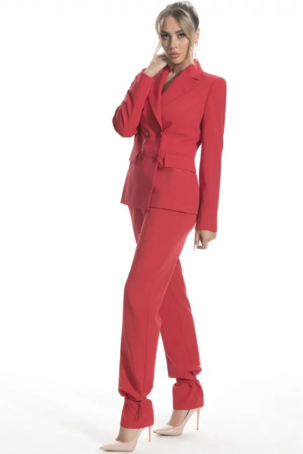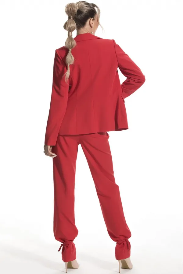 Описание внешнего вида: жакет с центральной двубортной застежкой на петли и пуговицы, втачным воротником и отложными лацканами пиджачного типа. По переду с рельефами, выходящими из проймы, талиевыми вытачками, прорезными карманами с клапаном и двумя обтачками. Спинка со средним швом, рельефами, выходящими из проймы. Брюки с отрезным поясом, на поясе расположены шлевки. Передние половинки с карманами, вход в карман наклонный к боковому шву. Застежка гульфик. По низу брюк- шнур, закрепленный на шаговом шве, декоративно завязывается вокруг ноги. Топ на широких бретелях, по переду со средним швом , талиевыми вытачками, по спинке со средним швом.. По низу топа- отрезной пояс. Топ с застежкой на потайную молнию в левом боковом шве.