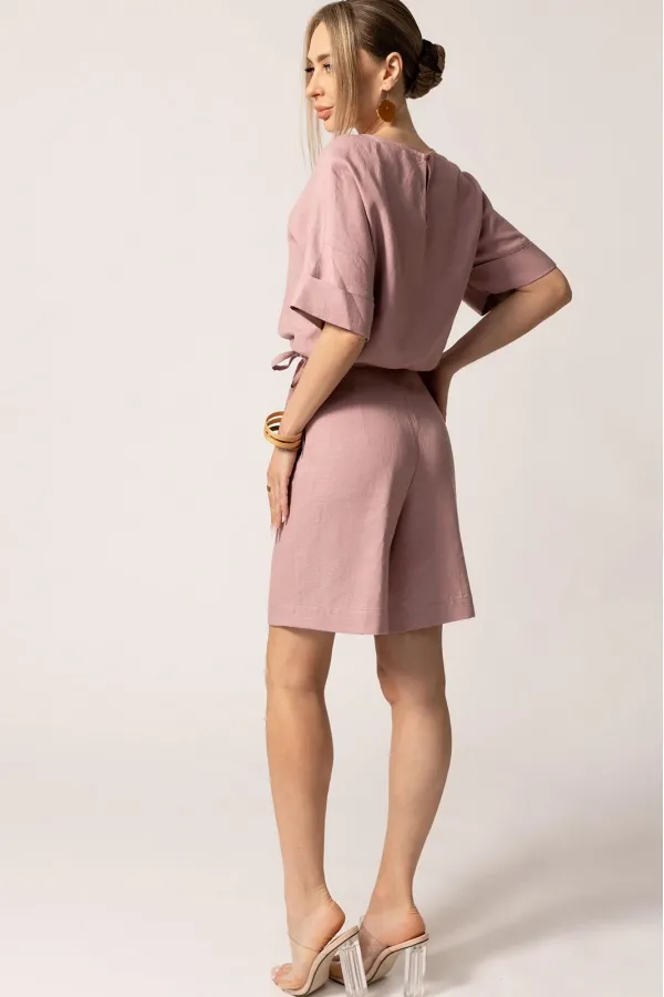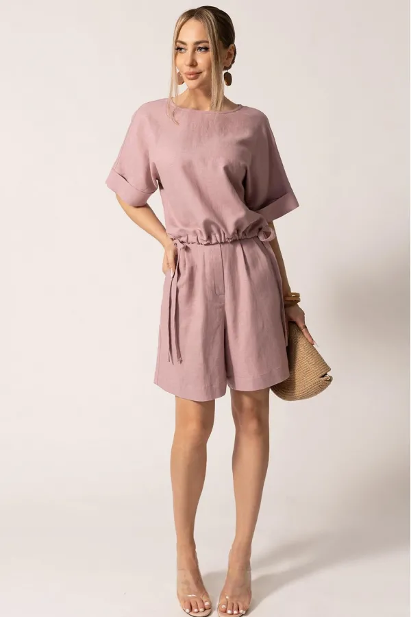 Комплект: блузка и шорты. Блузка с застежкой на навесную петлю и пуговицу по горловине спинки, без воротника, с круглым вырезом горловины. По горловине спинки -вырез каелька. Рукав цельнокроенный, короткий, с отложной манжетой. По низу блузки- кулиса с завязками. Шорты прямые, без пояса. По верхнему краю шорт- шлевки. В боковых швах расположены карманы.