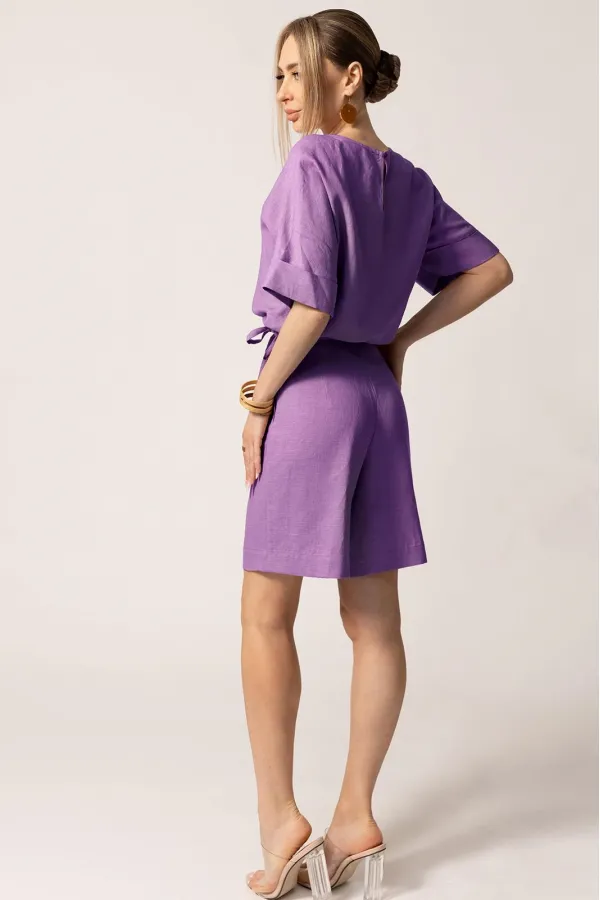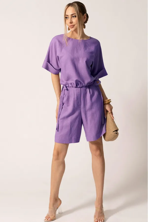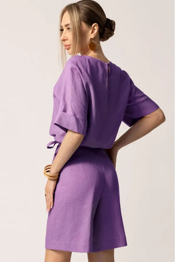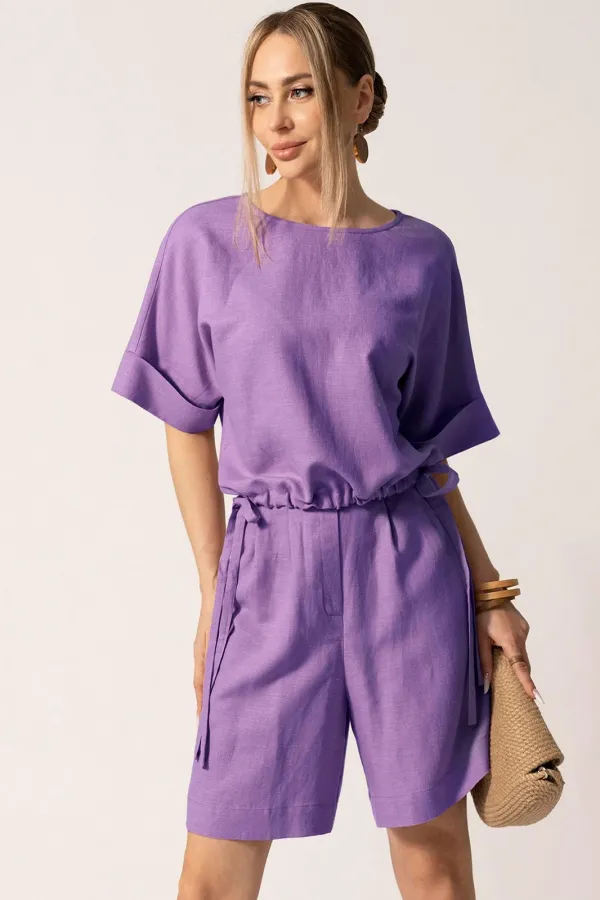 Комплект: блузка и шорты. Блузка с застежкой на навесную петлю и пуговицу по горловине спинки, без воротника, с круглым вырезом горловины. По горловине спинки -вырез каелька. Рукав цельнокроенный, короткий, с отложной манжетой. По низу блузки- кулиса с завязками. Шорты прямые, без пояса. По верхнему краю шорт- шлевки. В боковых швах расположены карманы.