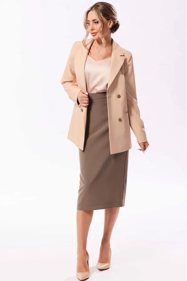 Комплектация: жакет, юбка. Жакет полуприлегающего силуэта с центральной двубортной застежкой на петли и пуговицы, с втачным воротником и отложными лацканами пиджачного типа. По переду с рельефами, выходящими из проймы, талиевыми вытачками. На уровне линии талии расположены прорезные карманы в рамку . Спинка со средним швом, рельефами, выходящими из проймы. Рукав втачной, длинный. Юбка прямая, с отрезным поясом. Пояс в области спинки присборен на резинку. Переднее полотнище цельное, заднее полотнище со средним швом, заканчивающимся щлицей. Застежка на потайную молнию.