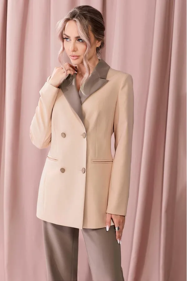 Комплектация: жакет, брюки. Жакет полуприлегающего силуэта с центральной двубортной застежкой на петли и пуговицы, с втачным воротником и отложными лацканами пиджачного типа. По переду с рельефами, выходящими из проймы, ... Читать далее...