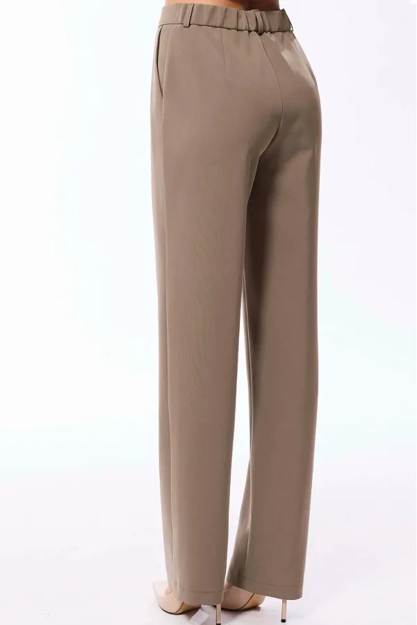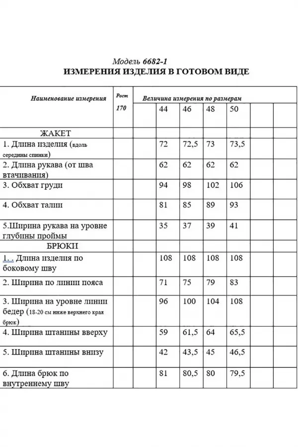Комплектация: жакет, брюки. Жакет полуприлегающего силуэта с центральной двубортной застежкой на петли и пуговицы, с втачным воротником и отложными лацканами пиджачного типа. По переду с рельефами, выходящими из проймы, талиевыми вытачками. На уровне линии талии расположены прорезные карманы в рамку . Спинка со средним швом, рельефами, выходящими из проймы. Рукав втачной, длинный. Брюки прямые, с отрезным поясом, на поясе расположены шлевки. Пояс в области спинки присборен на резинку. На передних половинках расположены карманы, вход в карман наклонный к боковому шву. Застежка гульфик.