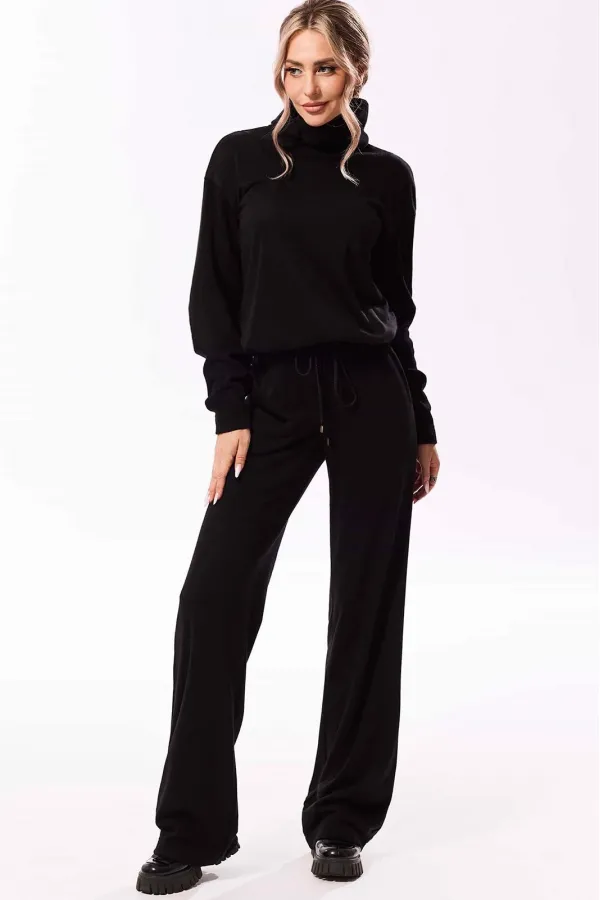 Комплектация: блузон, брюки. Блузон с высоким отрезным воротником- хомут. По переду с отрезной V- образной кокеткой. Спинка цельная. По низу блузона- кулиса со шнуром. Рукав втачной, длинный Плечо- спущенное. Брюки прямые, с отрезным поясом. Пояс присборен на резинку. В боковых швах расположены карманы .
