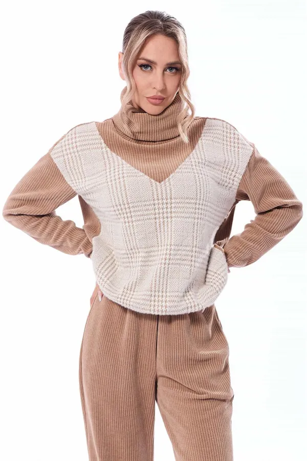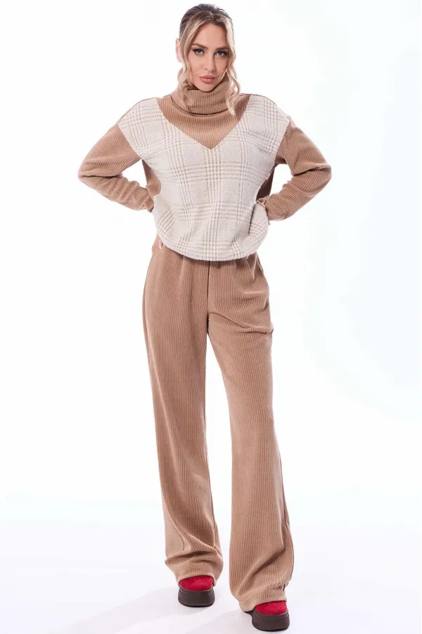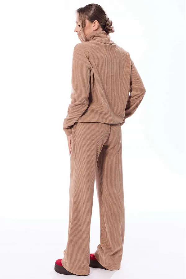 Комплектация: блузон, брюки. Блузон с высоким отрезным воротником- хомут. По переду с отрезной V- образной кокеткой. Спинка цельная. По низу блузона- кулиса со шнуром. Рукав втачной, длинный Плечо- спущенное. Брюки прямые, с отрезным поясом. Пояс присборен на резинку. В боковых швах расположены карманы .