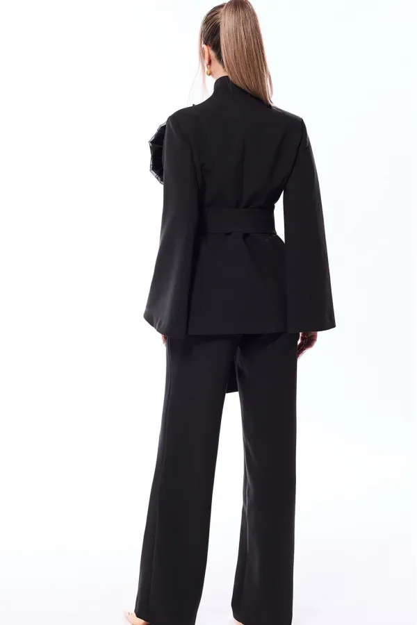Комплектация: жакет на подкладке, брюки, съемное украшение. жакет свободного силуэта, с центральной двубортной застежкой на пришивные кнопки . Цельнокроеный воротник-стойка переходит в V-образный вырез горловины. По переду с выточками и полурельефами. Спинка со средним швом, рельефами, выходящими из проймы. Рукав втачной, длинный, расширенный к низу. Пояс широкий, съемный, из основной ткани. Брюки с отрезным поясом. В области спинки пояс присборен на резинку. Передние половинки с карманами, вход в карман наклонный к боковому шву. Застежка гульфик.