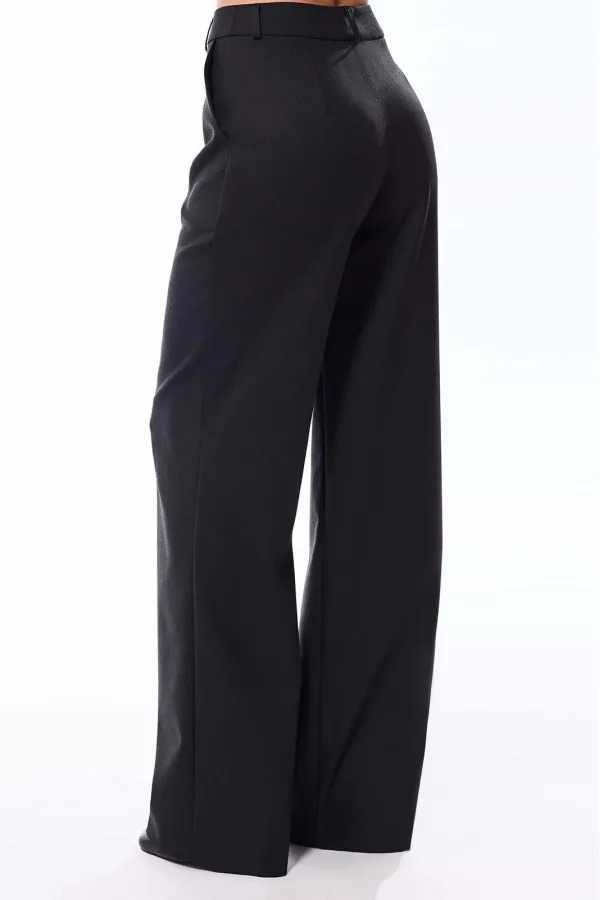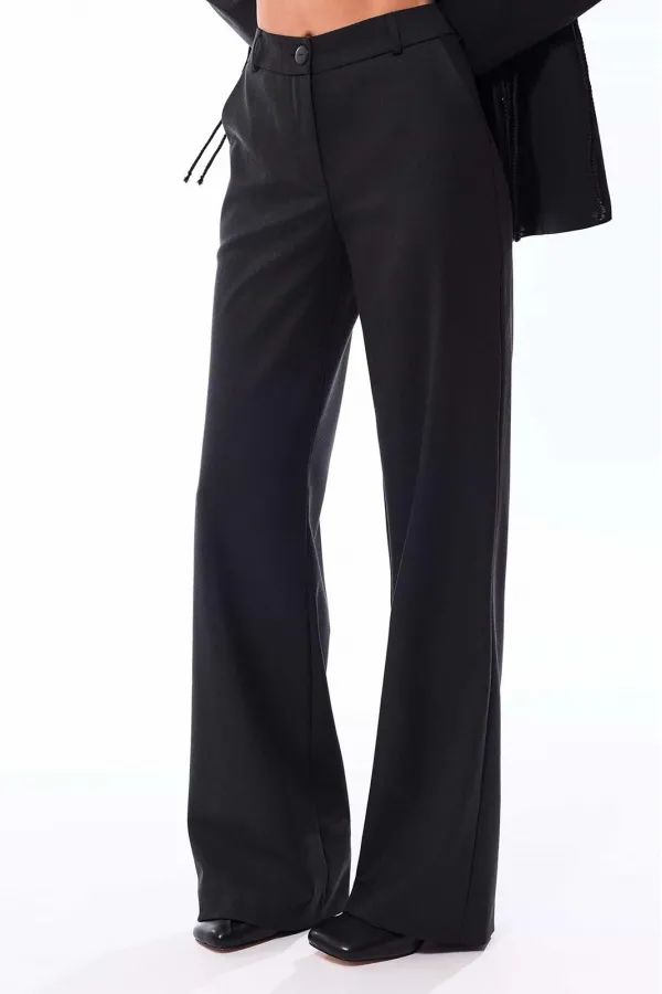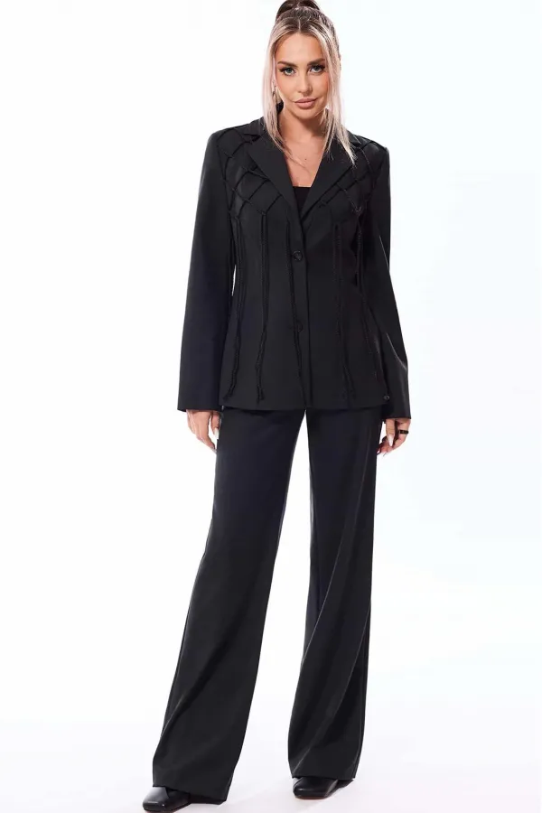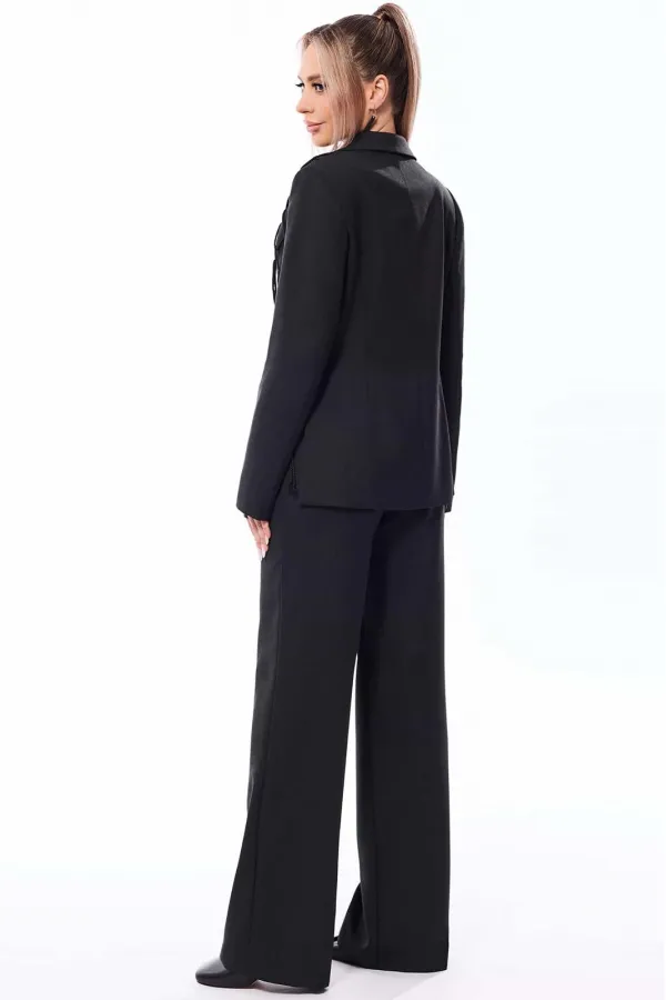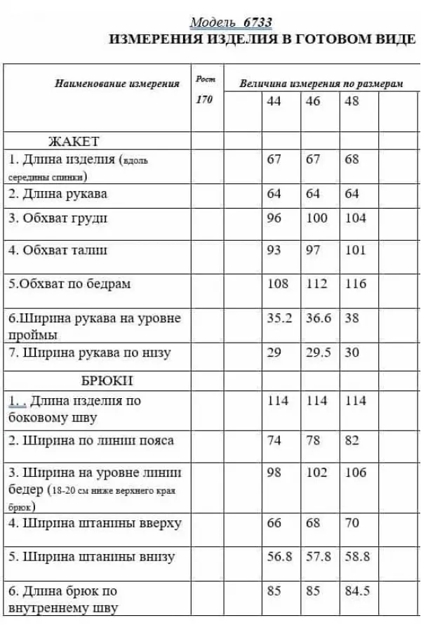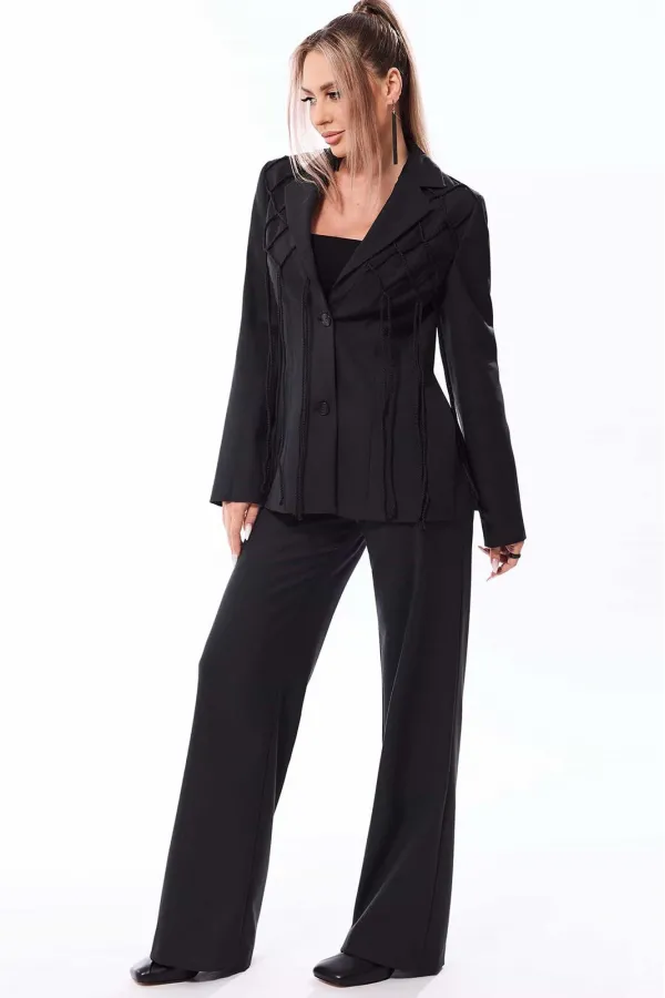 Комплектация: жакет на подкладке, брюки. Жакет с центральной застежкой на петли и пуговицы, отложным воротником и лацканами пиджачного типа. По переду с рельефами, выходящими из плеча. Спинка со средним швом, рельефами, выходящими из проймы. В боковых швах расположены разрезы. Полочки декорированы переплетением со шнуром. Рукав втачной, длинный. Брюки с отрезным поясом, на поясе расположены шлевки. В боковых швах расположены карманы. Вход в карман наклонный к боковому шву. Застежка гульфик.