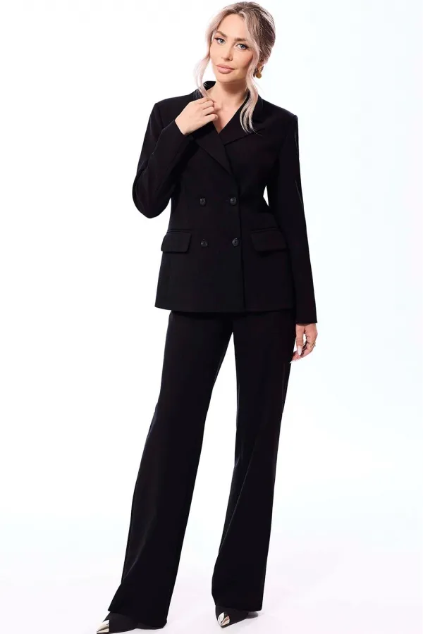 Комплектация: жакет, брюки. жакет с центральной двубортной застежкой на петли и пуговицы, отложным воротником и лацканами пиджачного типа. По переду с рельефами, выходящими из проймы, талиевыми вытачками, прорезными карманами с клапанами и двумя обтачками. Спинка со средним швом, рельефами, выходящими из проймы. Рукав втачной, длинный. Брюки с отрезным поясом, на поясе расположены шлевки. В боковых швах расположены карманы. Вход в карман наклонный к боковому шву. Застежка гульфик. Пояс в области спинки присборен на резинку.