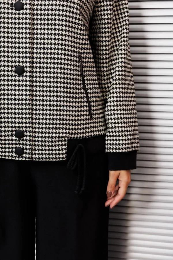 Бомбер свободного силуэта, вырез горловины округлый с довязом, рукав втачной на манжете из резинки по низу. По переду бомбера кокетка и карманы на молнии. Застежка на петли и пуговицы. Бомбер на подкладке.