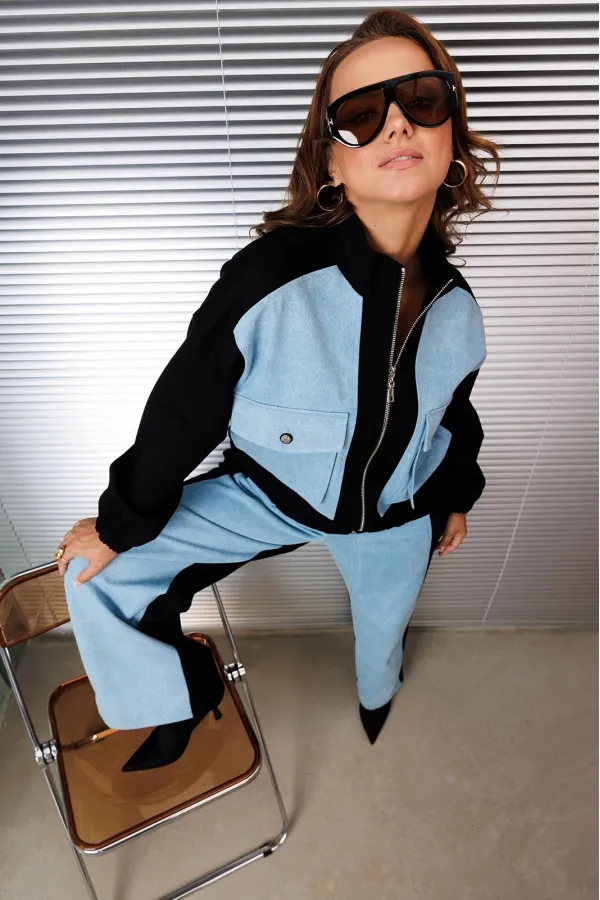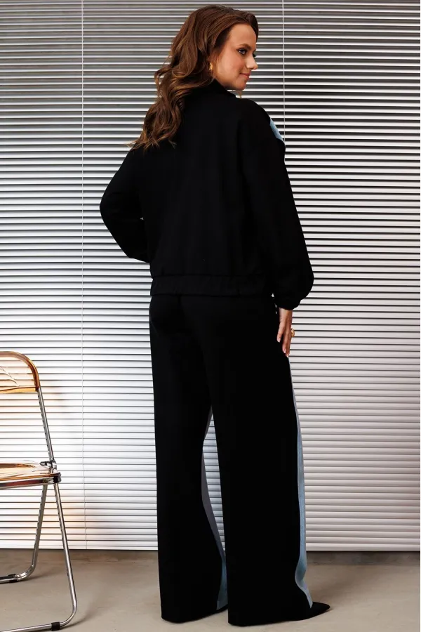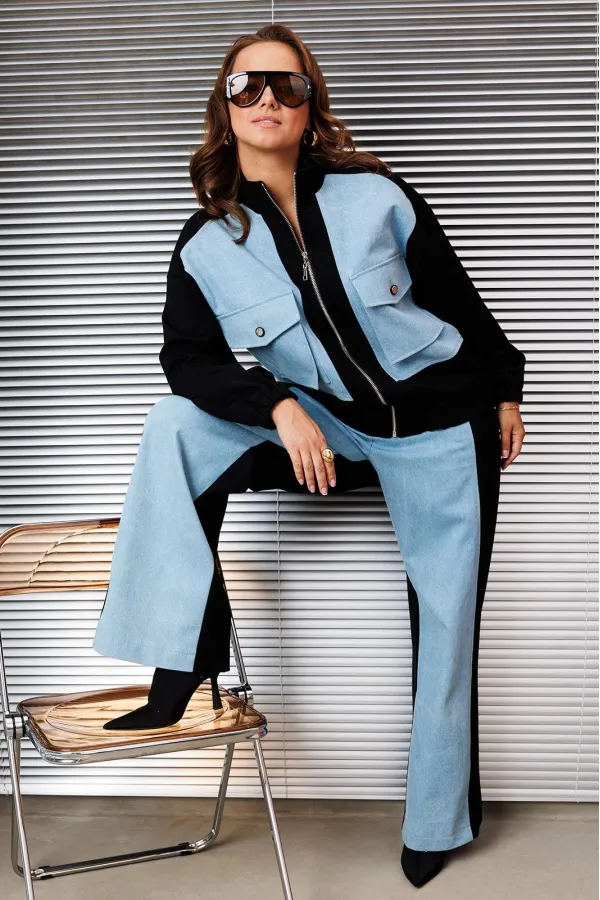 Комплект женский состоящий из бомбера и брюк. Бомбер свободного силуэта на резинке по низу, вырез горловины со стойкой. Рукав спущенный, длинный на резинке внизу. Бомбер комбинированный из двух тканей. Без подкладки. По ... Читать далее...