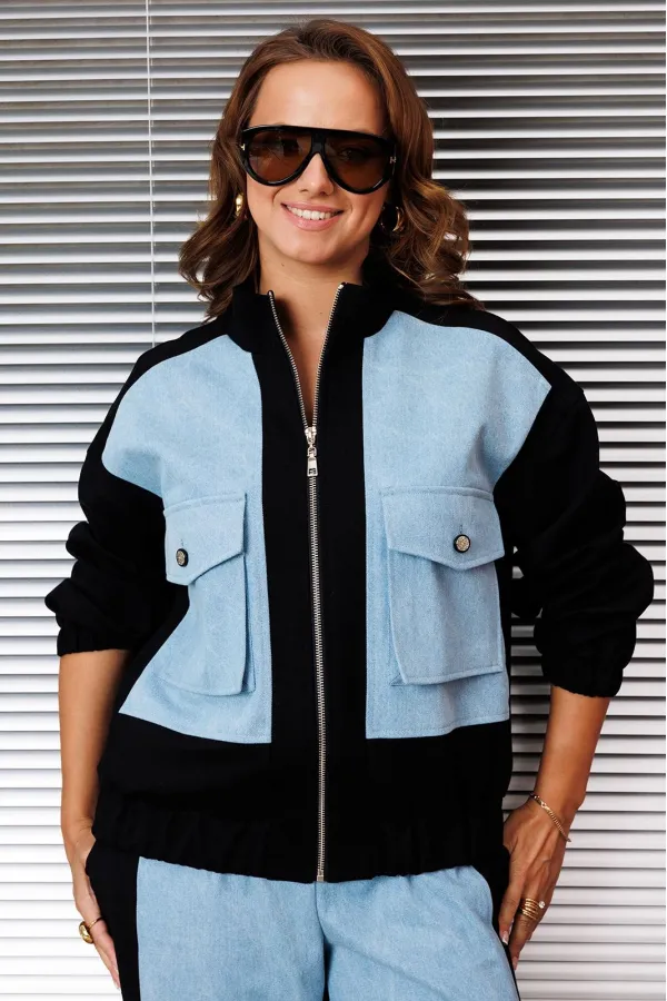 Бомбер свободного силуэта на резинке по низу, вырез горловины со стойкой. Рукав спущенный, длинный на резинке внизу. Бомбер комбинированный из двух тканей. Без подкладки. По переду накладные карманы-портфель.