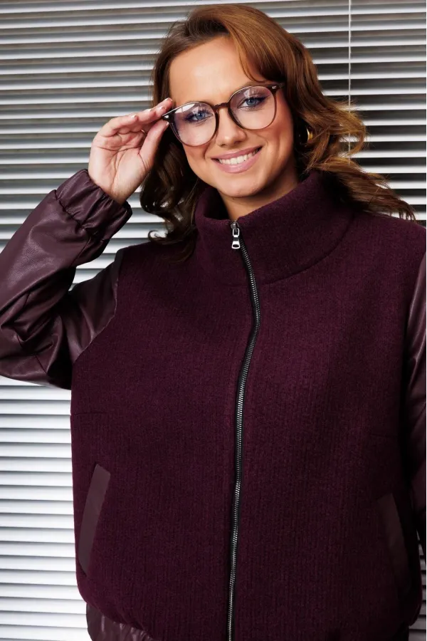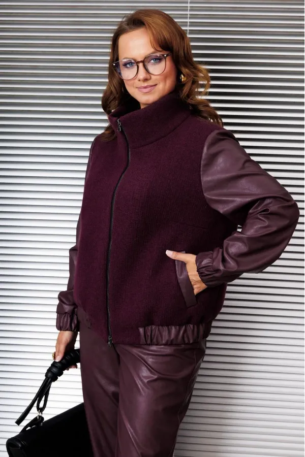 Жакет-бомбер свободного силуэта, выполнен в сочетании из двух тканей, горловина - стойка. Рукав втачной, на резинке по низу. По переду карманы с листочкой, по низу жакет на резинке. Застежка на тесьму-молнию. Изделие на подкалке.