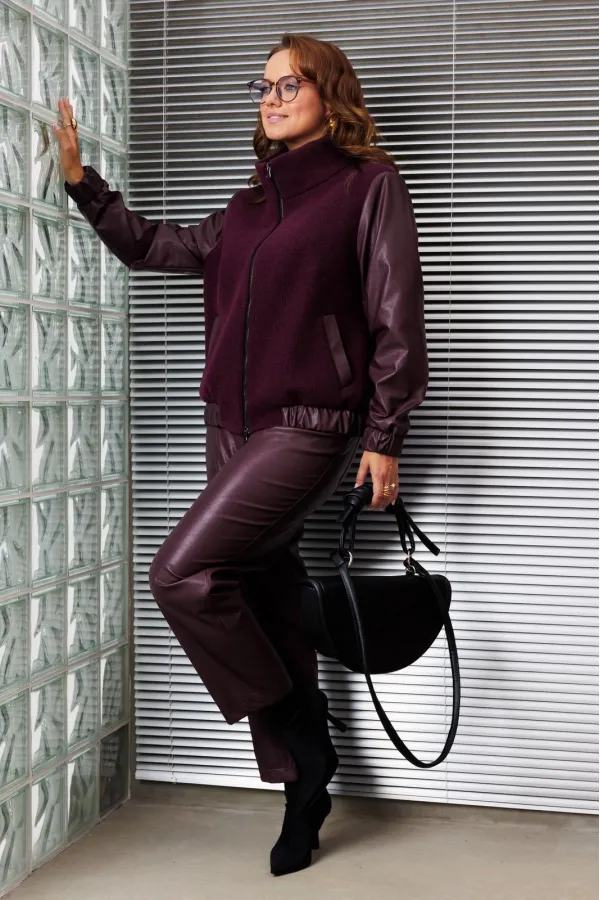 15% шерсть 70%вискоза 15% полиэстер Кожа: лицевая сторона- 100% полиуретан изнанка-100% хлопок. Брюки-лицевая сторона 100% полиуретан изнанка 100% хлопок.