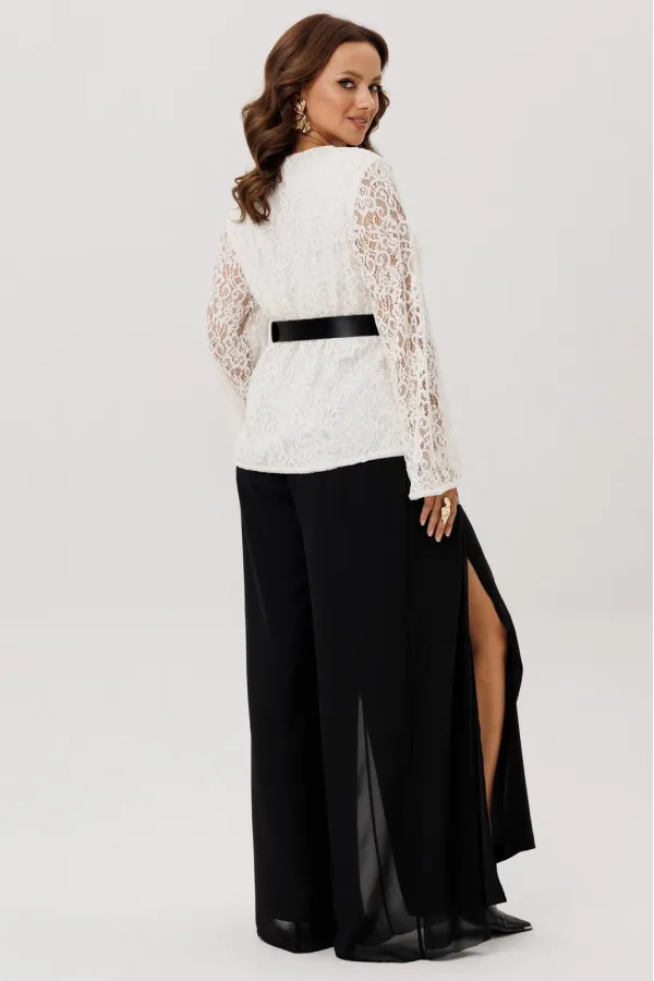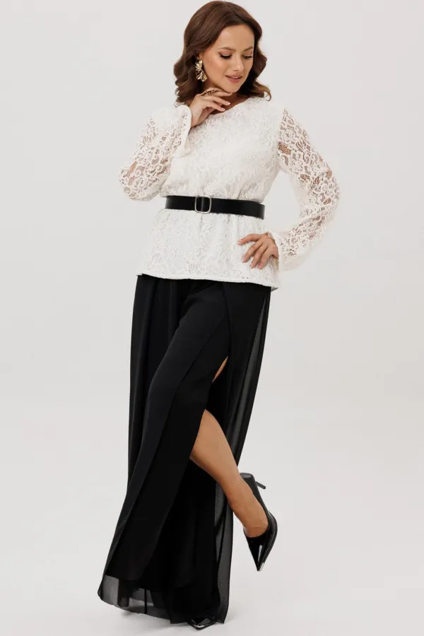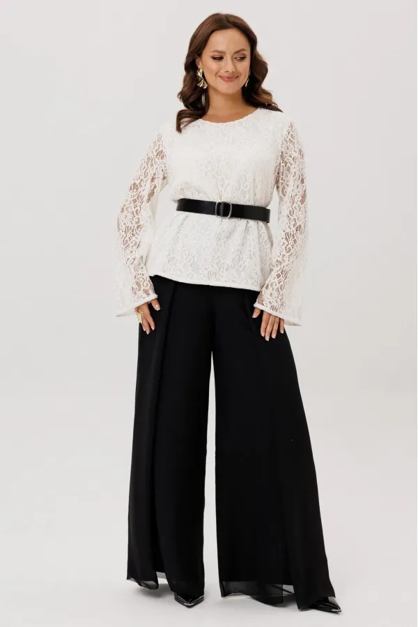 Комплект двойка состоящий из блузки и брюк.Блузка полуприлегающего силуэта, вырез горловины округлый, рукав втачной-клеш. Изделие на подкладке, без застежки.Брюки -палаццо двойные. По талии на резинке, по переду складки ... Читать далее...