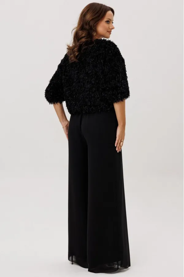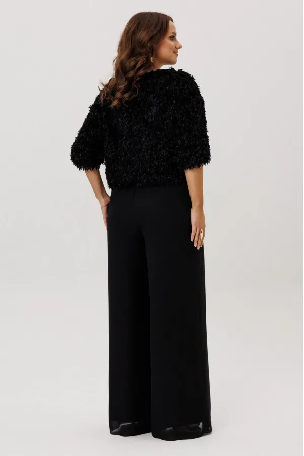 Комплект двойка состоящий из джемпера и брюк.Джемпер свободного силуэта на резинке по низу и рукаве. Вырез горловины округлый, рукав цельнокроеный, застежка по спинке на петлю и пуговицу. Изделие на подкладке.Брюки -пала... Читать далее...