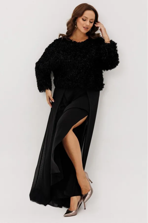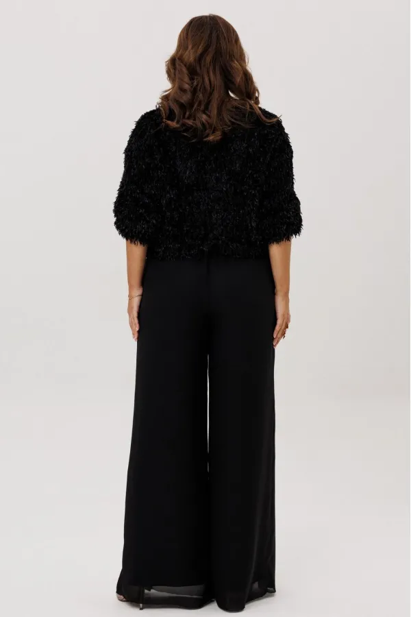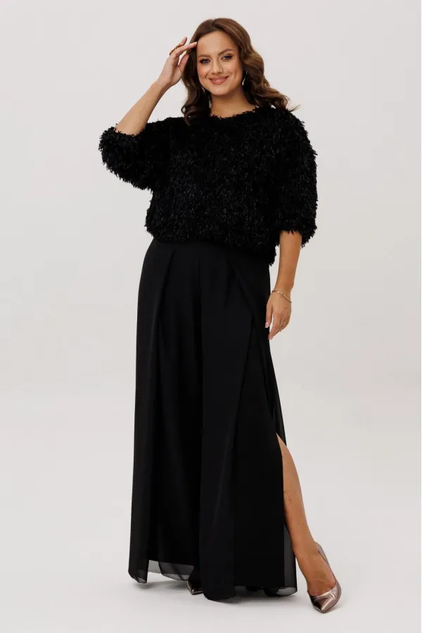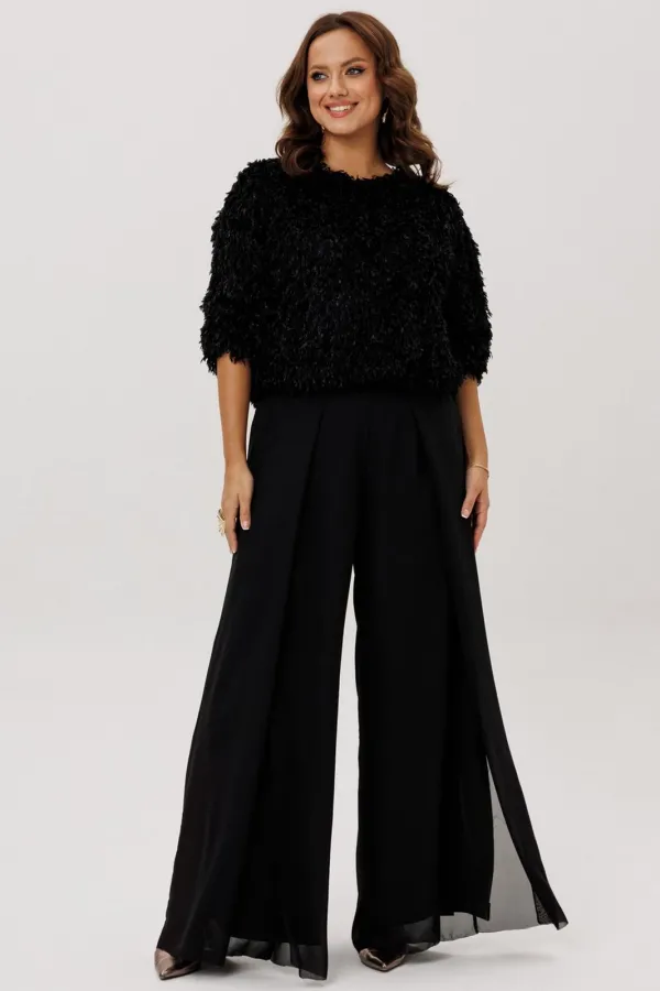 Брюки -палаццо двойные. По талии на резинке, по переду складки и разрезы. Без карманов.