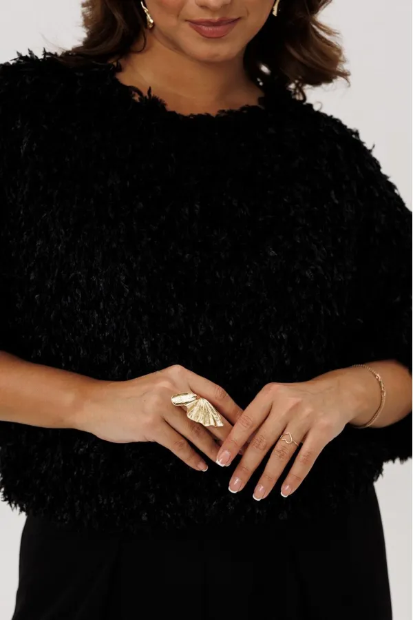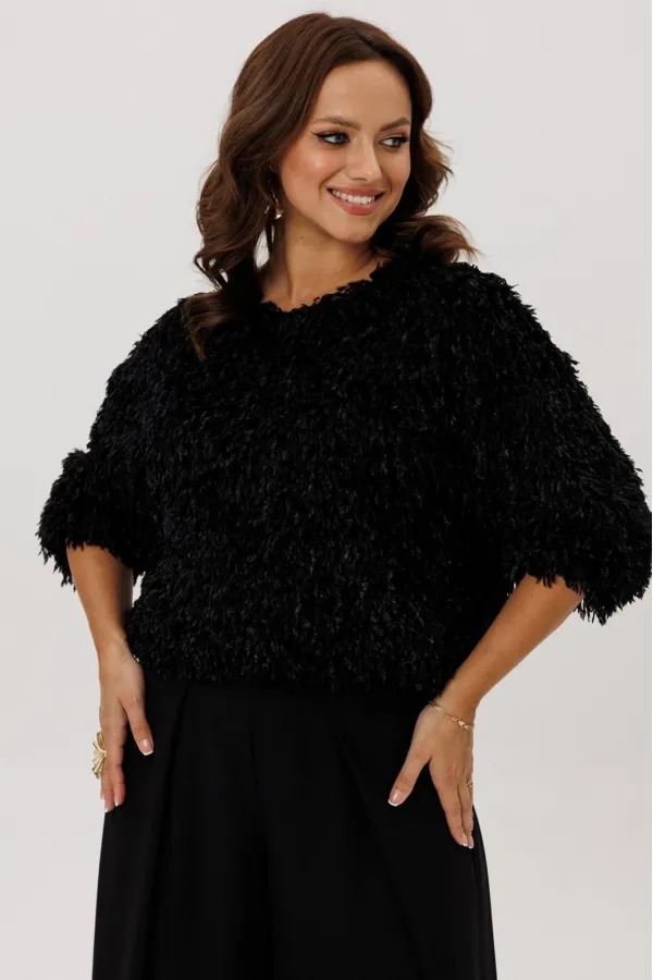Джемпер свободного силуэта на резинке по низу и рукаве. Вырез горловины округлый, рукав цельнокроеный, застежка по спинке на петлю и пуговицу. Изделие на подкладке.