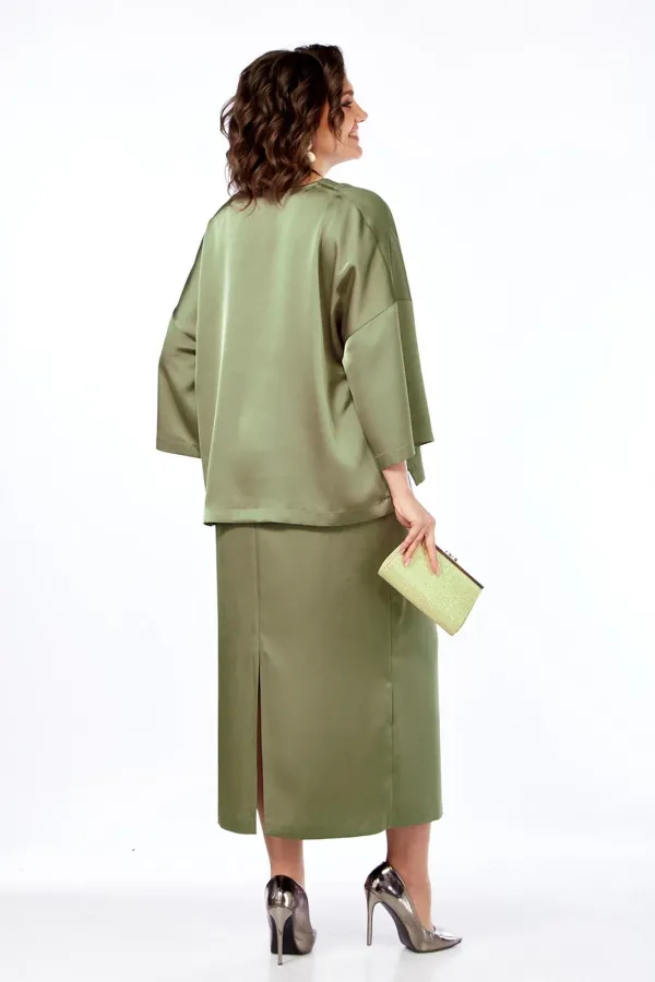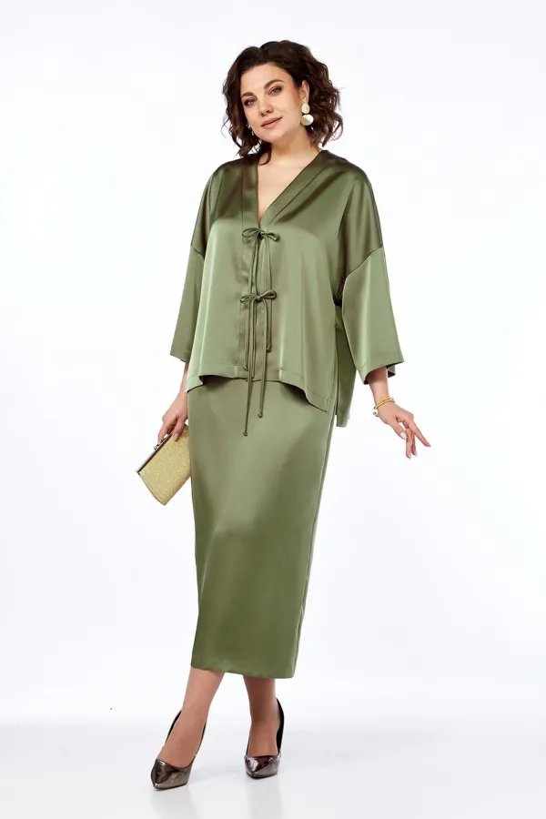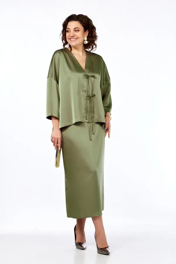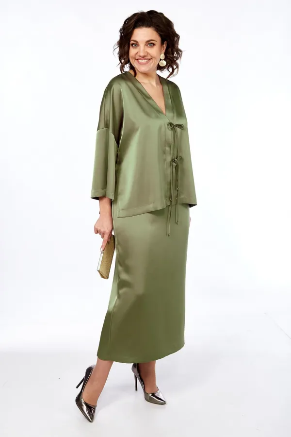 Костюм женский, юбочный изготовлен из костюмно — плательной ткани. Блуза свободного кроя, горловина V-образной формы. По краю борта притачные планки, застежка на завязках. Рукава спущенные, длинной 3/4 . Юбка прямая, верх на обтачке, застежка потайная молния в заднем шве, разрез внизу. Юбка на подкладке.