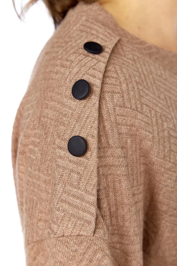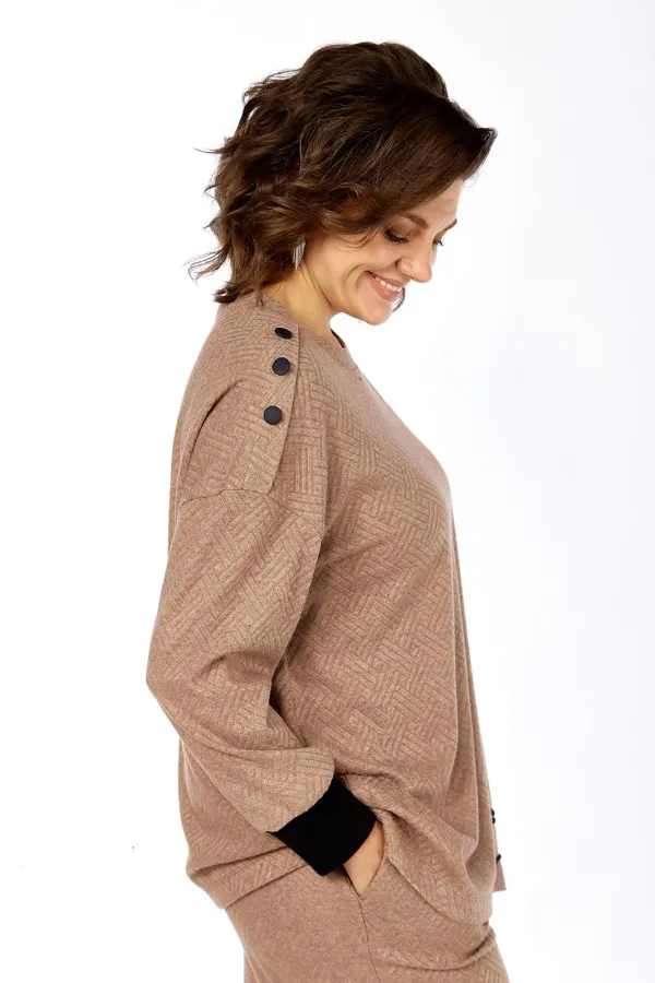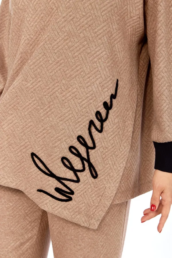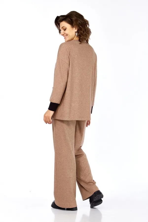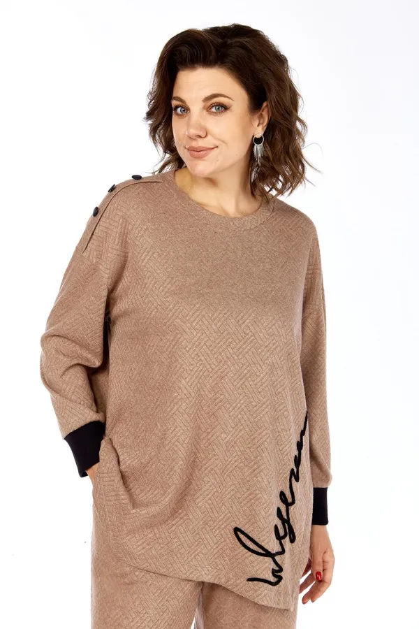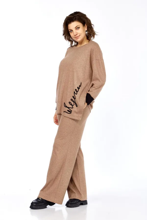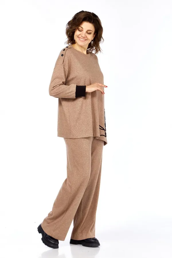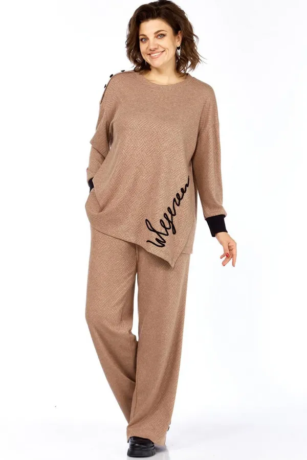 Костюм брючный двухпредметный состоит из джемпера и брюк. Выполнен из трикотажного полотна. Джемпер свободного силуэта, горловина округлой формы. Перед с асимметричным подрезом. Рукава спущенные, по низу притачные манжеты.. Джемпер дополнен вышивкой и пуговицами. Брюки свободного силуэта, с притачным поясом на эластичной тесьме. В передних деталях брюк обработаны карманы.