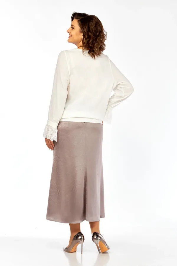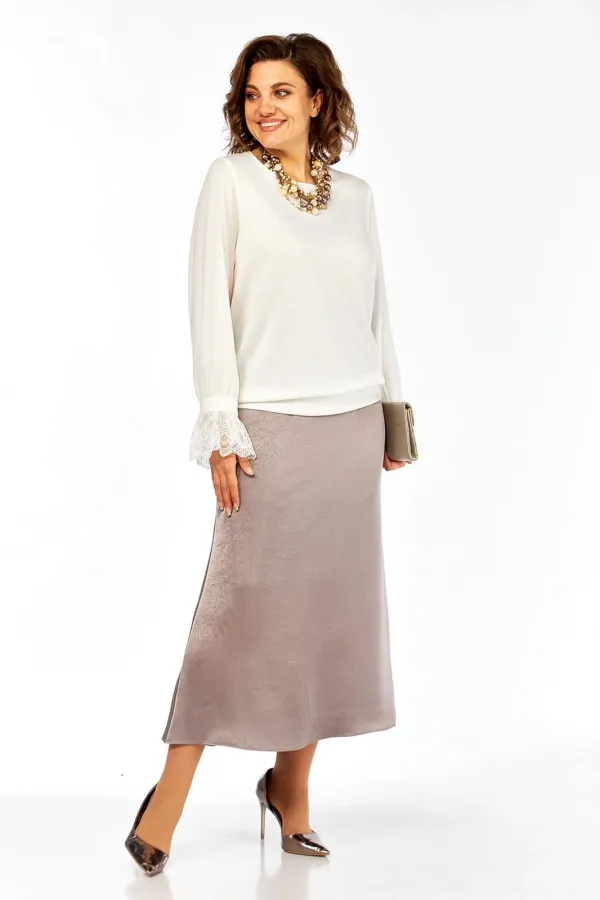 Комплект женский нарядный, состоит из джемпера и юбки. Джемпер выполнен из трикотажного полотна с икринкой. Перед и спинка цельнокроеные. Горловина круглой формы. Рукава втачные, по низу декоративные элементы с кружевом. Низ изделия с притачной деталью. Юбка — годе выполнена из костюмно — плательной ткани с застежкой на потайную тесьму-молнию в среднем шве заднего полотнища. Юбка на подкладке.