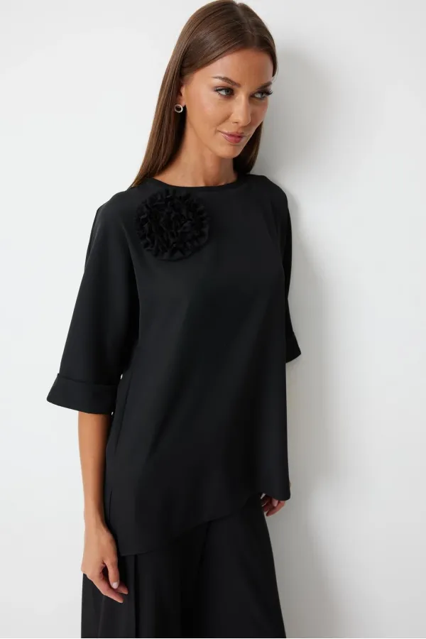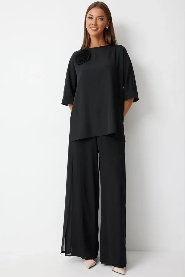 Костюм состоит из блузы и брюк. Блуза женская прямого силуэта закрывающая линию паха с цельнокроеными рукавами. К блузке прилагается съёмный декор – цветок. По боковым швам располагаются разрезы. Спинка с центральным швом и застежкой на навесную петлю и пуговицу. Горловина обработана косой бейкой. Рукав до локтя, низ рукава обработан отрезной отворачивающейся манжетой, закрепленной по швам. Низ блузки обработан швом «в подгибку». Брюки прямого силуэта, выполнены из шифоновой ткани на подкладке полной длинны. Боковой шов брюк открыт. Синка брюк заходит на перед по верхней части. Подкладка из не просвещающейся креповой ткани. Верх брюк обработан отрезным поясом. Центральная часть пояса без резинки, остальной пояс на резинке. Низ брюк обработан швом « в подгибку». Цвет материала может отличаться по тону в зависимости от настроек вашего монитора!.
