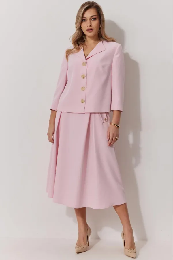 Костюм женский, состоящий из жакета и юбки. Жакет на подкладке, с рукавом и центральной однобортной застежкой на петли и декоративные пуговицы. Длина жакета до линии бедра. По переду обработаны наклонные вытачки. Спинка со средним швом. Горловина V-образной формы с отворачивающимися лацканами. Линия горловины обработана обтачкой. Рукав втачной, двухшовный ¾ длины. Юбка женская на подкладке А – силуэта длиной до середины икры. По переду юбки заложены встречные складки и нстрочены клапаны с декоративными пуговицами. Спинка юбки цельная. Карманы обработаны в боковом шве юбки. По левому боковому шву юбки находится застежка – молния. Верхний срез юбки обработан притачным поясом с резинкой по спинке.