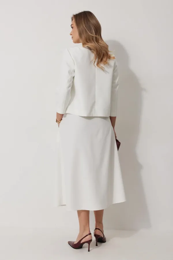 Длина спинки жакета 57 см, длина рукава 48 см, длина юбки по боковому шву 78,5 см.