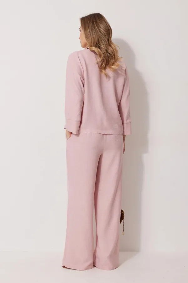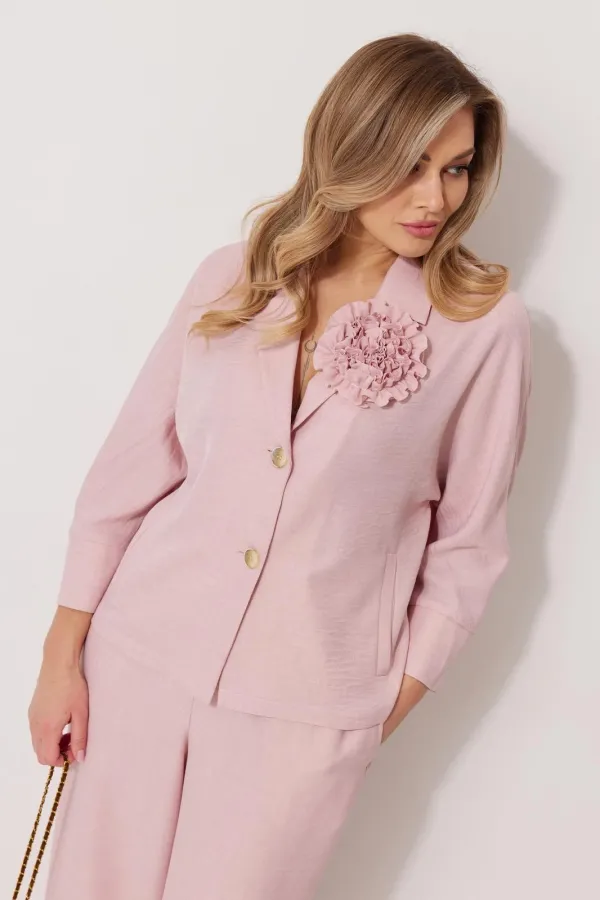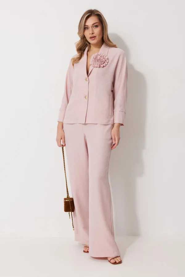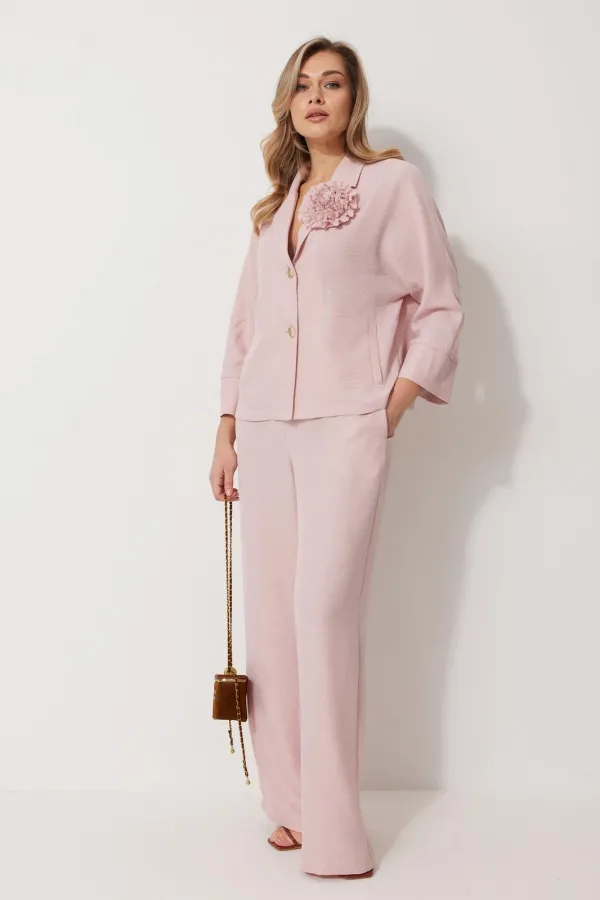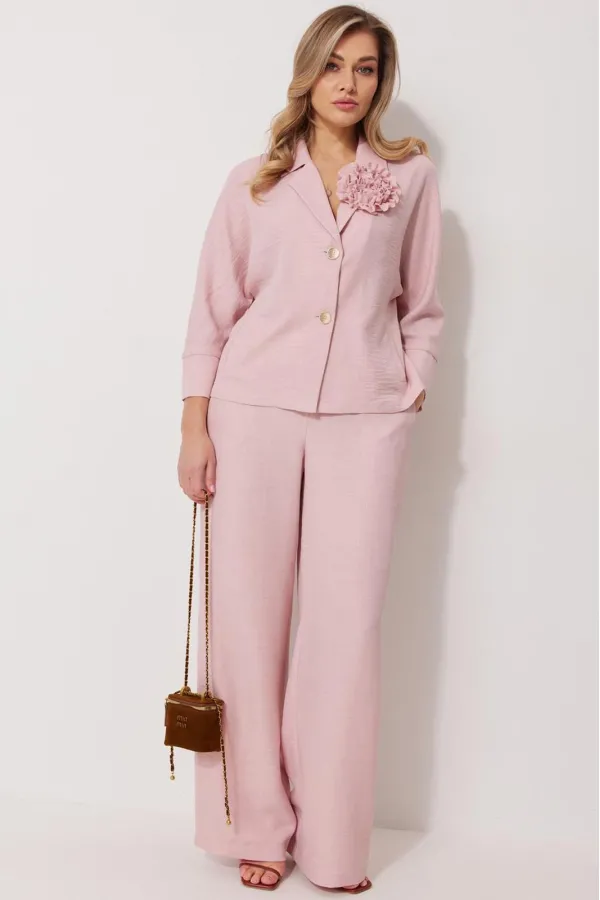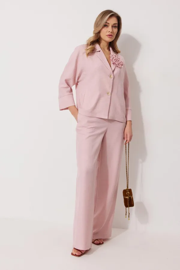 Костюм женский, состоящий из жакета и брюк. Жакет без подкладки, кроя «летучая мышь», с центральной однобортной застежкой на петли и пуговицы. По переду обработаны вертикальные прорезные карманы с листочкой. Спинка цельнокроеная, слева расположен декор в виде авторской броши. Горловина V-образной формы, обработана воротником пиджачного типа. Рукав 7/8, по низу обработан широкой притачной манжетой. Брюки женские, расширенные. По переду обработана застежка на молнию, обработаны карманы с наклонным входом. На задних половинках брюк застрочены вытачки. Верх обработан широким притачным поясом (частично на резинке), застегивающимся на петлю и пуговицу.