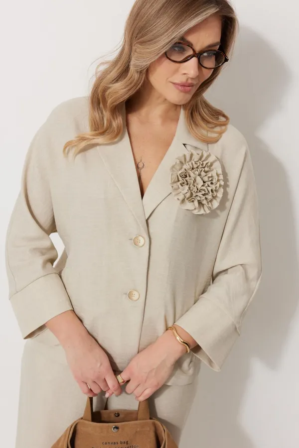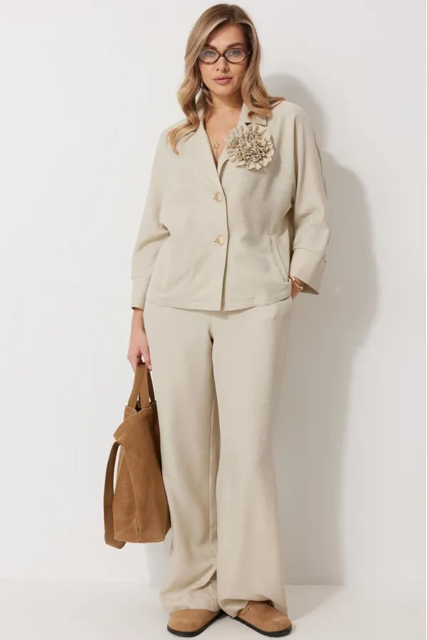 Костюм женский, состоящий из жакета и брюк. Жакет без подкладки, кроя «летучая мышь», с центральной однобортной застежкой на петли и пуговицы. По переду обработаны вертикальные прорезные карманы с листочкой. Спинка цельнокроеная, слева расположен декор в виде авторской броши. Горловина V-образной формы, обработана воротником пиджачного типа. Рукав 7/8, по низу обработан широкой притачной манжетой. Брюки женские, расширенные. По переду обработана застежка на молнию, обработаны карманы с наклонным входом. На задних половинках брюк застрочены вытачки. Верх обработан широким притачным поясом (частично на резинке), застегивающимся на петлю и пуговицу.