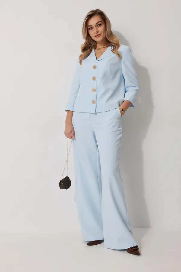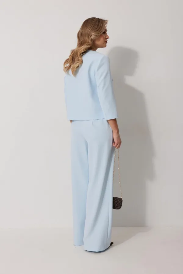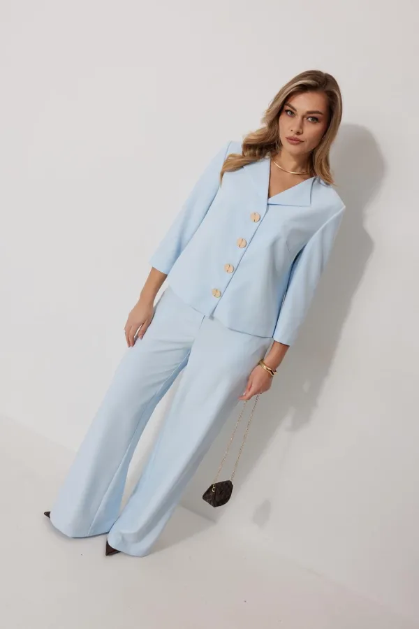 Костюм женский, состоящий из жакета и брюк. Жакет на подкладке, с рукавом и центральной однобортной застежкой на петли и декоративные пуговицы. Длина жакета до линии бедра. По переду обработаны наклонные вытачки. Спинка со средним швом. Горловина V-образной формы с отворачивающимися лацканами. Линия горловины обработана обтачкой. Рукав втачной, двухшовный ¾ длины. Брюки женские, прямого силуэта. По переду обработана застежка на молнию. Карманы наклонные с отрезным бочком. На задних половинках брюк застрочены вытачки. Верх обработан широким притачным поясом (частично на резинке), застегивающимся на петлю и пуговицу.