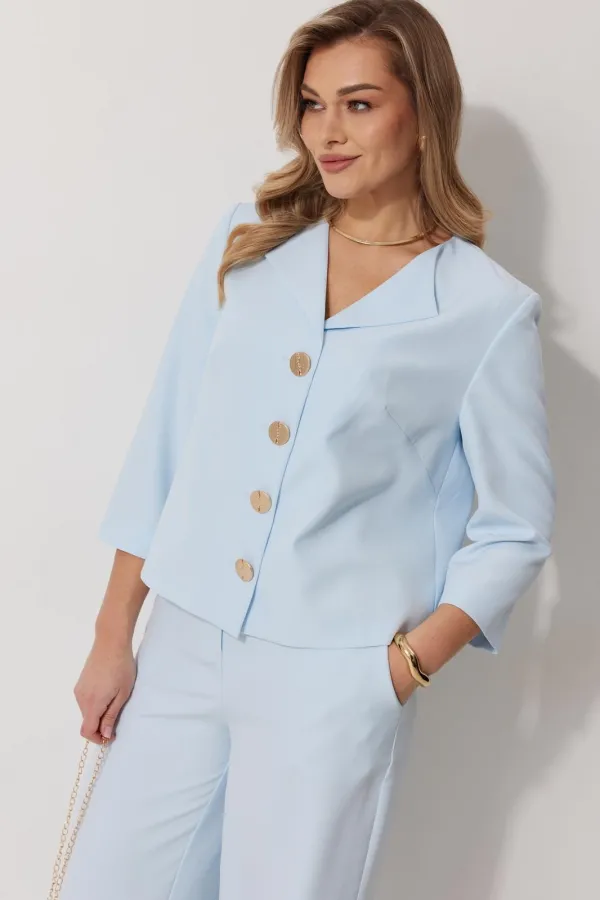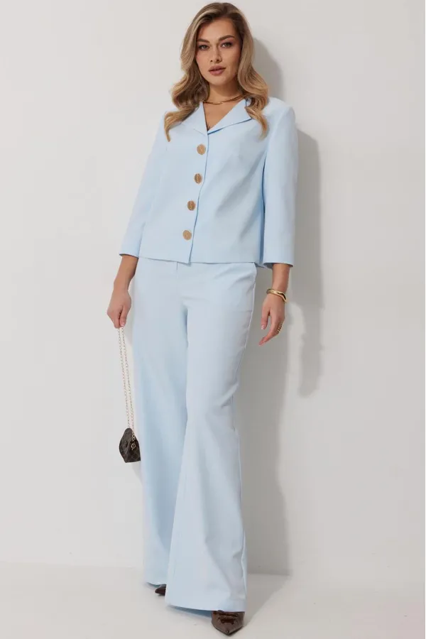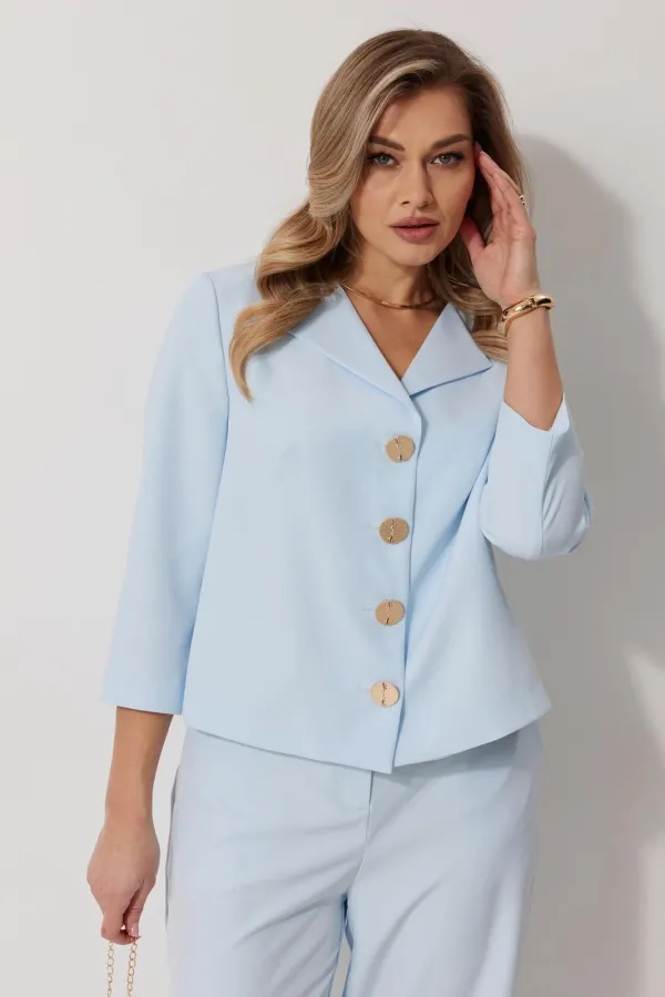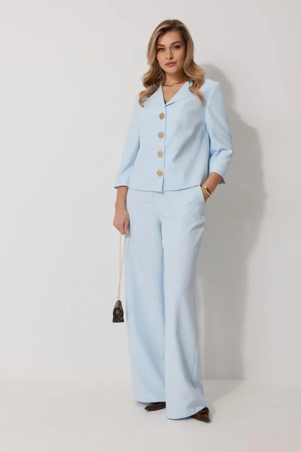 Костюм женский, состоящий из жакета и брюк. Жакет на подкладке, с рукавом и центральной однобортной застежкой на петли и декоративные пуговицы. Длина жакета до линии бедра. По переду обработаны наклонные вытачки. Спинка ... Читать далее...