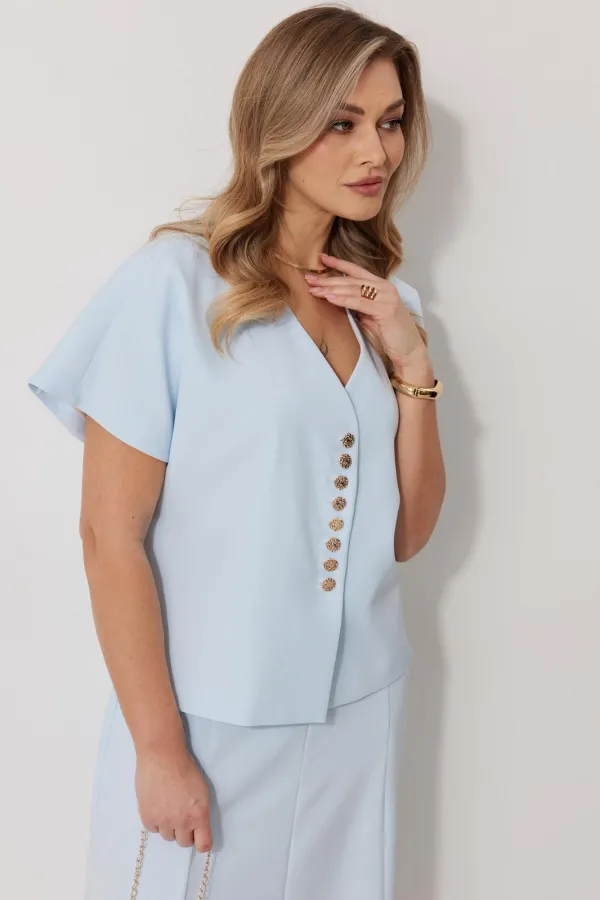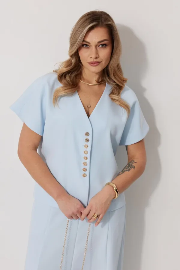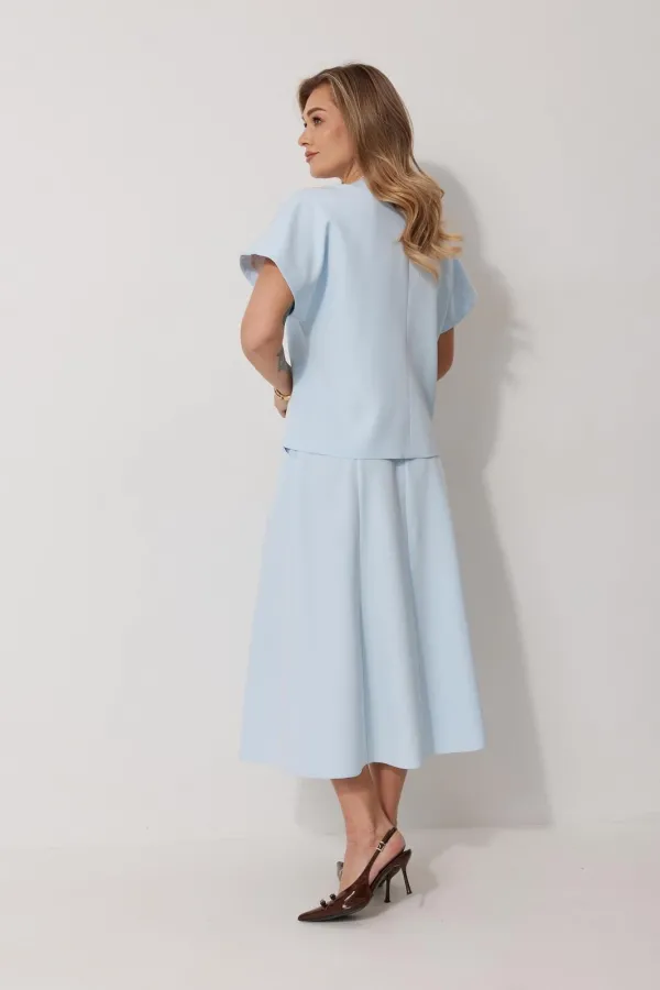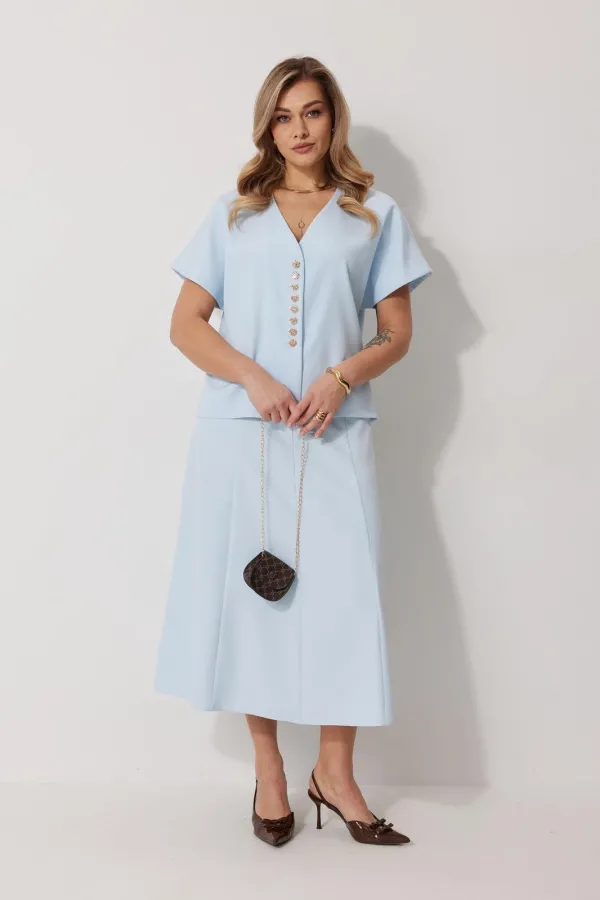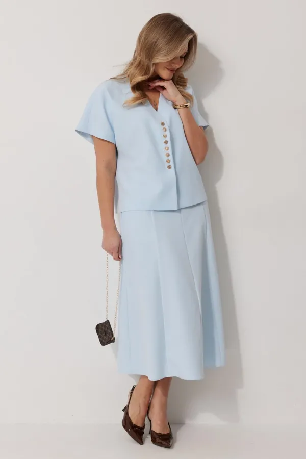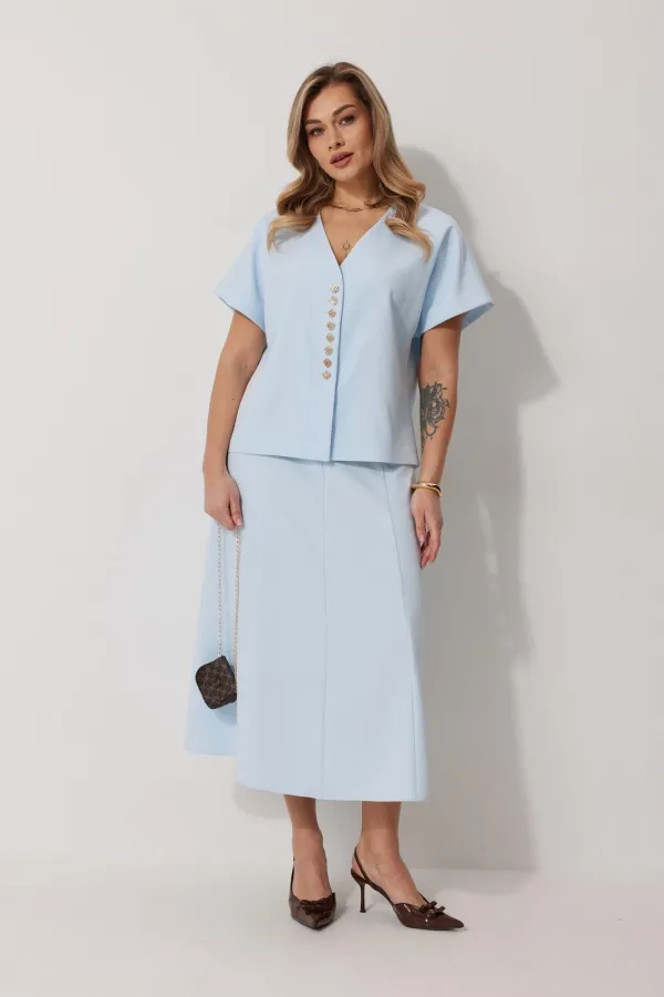 Костюм женский, состоящий из жилета и юбки. Жилет прямого силуэта на подкладке со спущенной линией плеча длиной до линии бедра. Спинка с центральным швом. Горловина V-образной формы обработана подбортом с обтачкой. Застежка жилета центральная на декоративные пуговицы. Юбка на подкладке женская А – силуэта длиной до середины икры. Перед юбки состоит из 4 клиньев. Вверху передней части юбки располагается карман с отрезным бочком. Спинка юбки состоит из 4 клиньев. По среднему шву юбки находится застежка – молния. Верхний срез юбки обработан обтачкой.