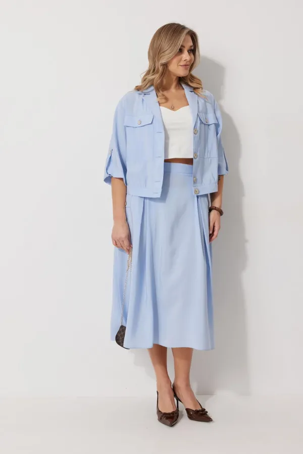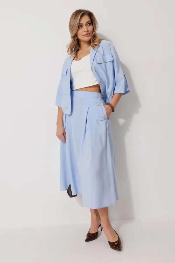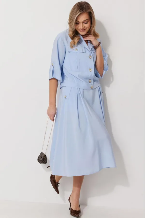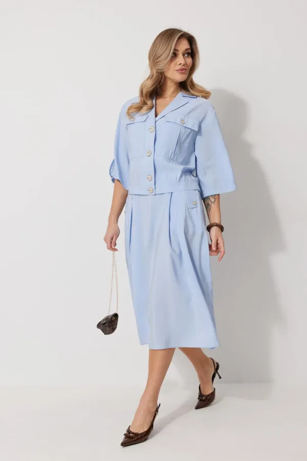 Костюм женский, состоящий из жакета и юбки. Жакет прямого силуэта без подкладки, длиной до линии бедра. По переду жакета настрочены накладные карманы с встречными складками. В шве притачивания кокетки расположен клапан кармана, застегивающийся на петлю и пуговицу. В среднем шве спинки расположена встречная складка. Рукав втачной одношовный, прямой. По низу рукава расположена пата, застегивающаяся на петлю и пуговицу. По низу жакета обработан отрезной пояс. Горловина обработана втачным воротником с лацканами. Застежка центральная , однобортная на петли пуговицы. Юбка женская на подкладке А – силуэта длиной до середины икры. По переду юбки заложены встречные складки и нстрочены клапаны с декоративными пуговицами. Спинка юбки цельная. Карманы обработаны в боковом шве юбки. По левому боковому шву юбки находится застежка – молния. Верхний срез юбки обработан притачным поясом с резинкой по спинке.