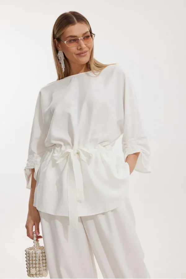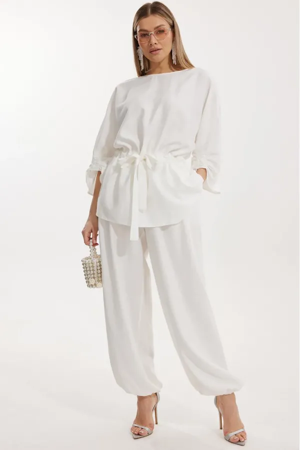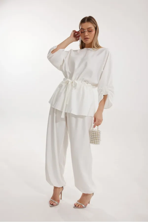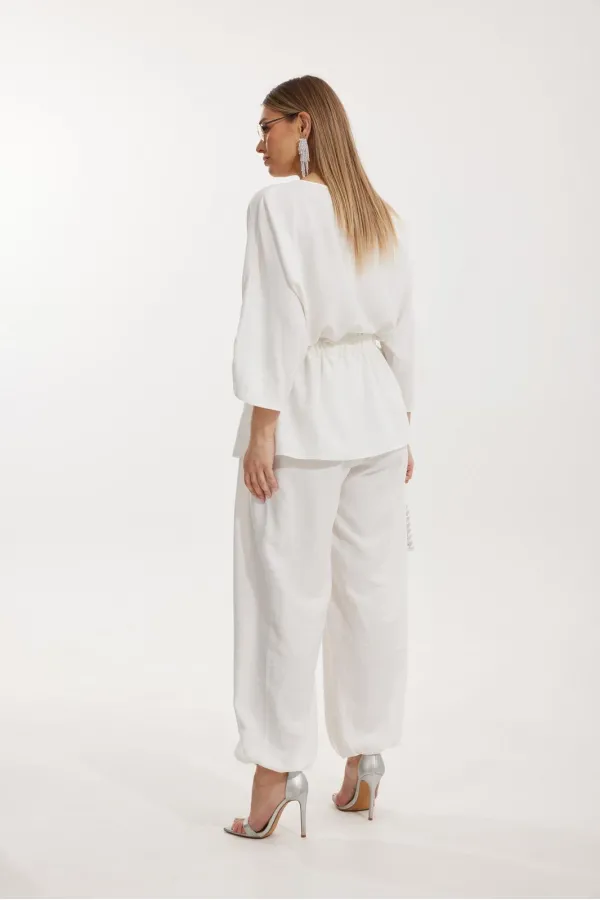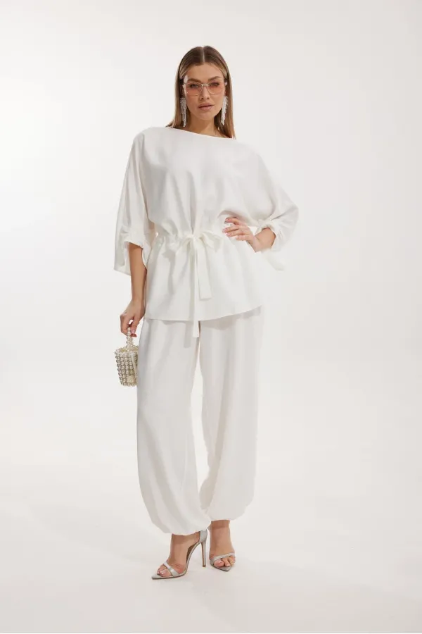 Костюм женский, состоящий из блузы и брюк. Блуза кроя «летучая мышь» длиной за линию бедра. Перед цельный с округлой горловиной. Спинка со средним швом. В районе талии обработана кулиса с широким поясом. По низу рукава по передней части выполнено несколько рядов сборки. Горловина обработана окантовкой. Брюки прямого силуэта с поясом на резинке. По передним половинкам заложены складки и обработаны наклонные карманы с отрезным бочком По низу брюки собраны на резинку. Верхний срез брюк обработан отрезным поясом на частичной резинке.