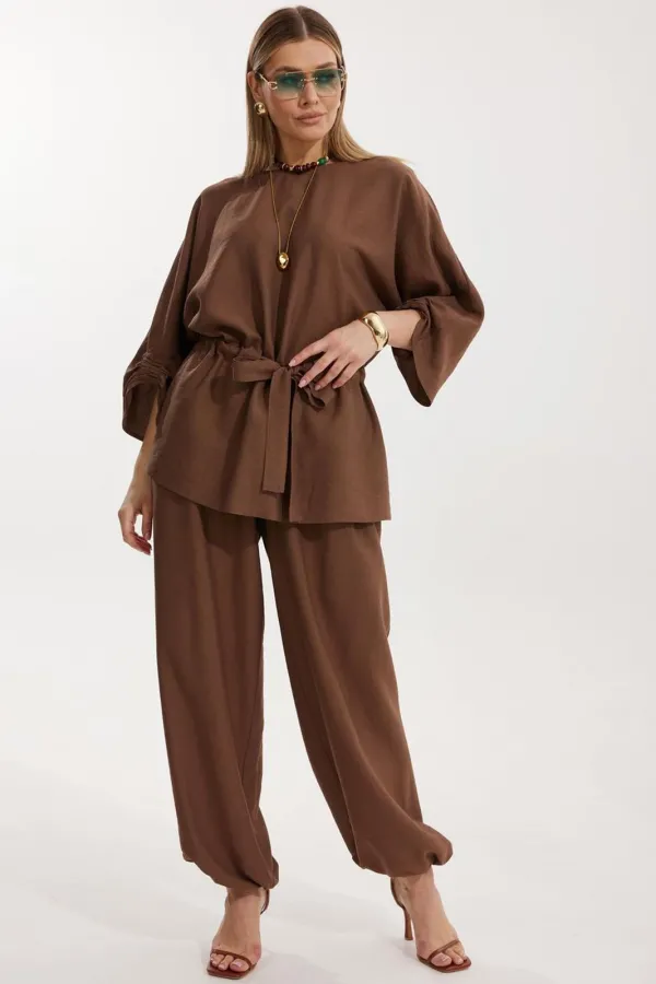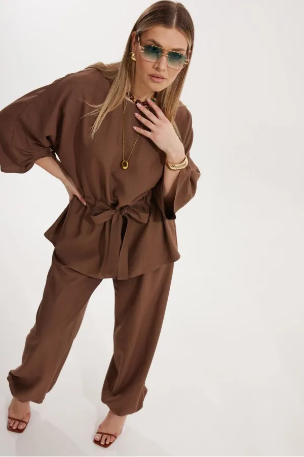 Костюм женский, состоящий из блузы и брюк. Блуза кроя «летучая мышь» длиной за линию бедра. Перед цельный с округлой горловиной. Спинка со средним швом. В районе талии обработана кулиса с широким поясом. По низу рукава по передней части выполнено несколько рядов сборки. Горловина обработана окантовкой. Брюки прямого силуэта с поясом на резинке. По передним половинкам заложены складки и обработаны наклонные карманы с отрезным бочком По низу брюки собраны на резинку. Верхний срез брюк обработан отрезным поясом на частичной резинке.
