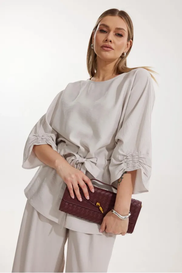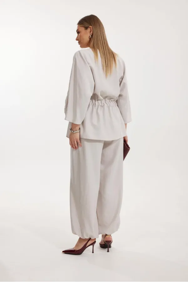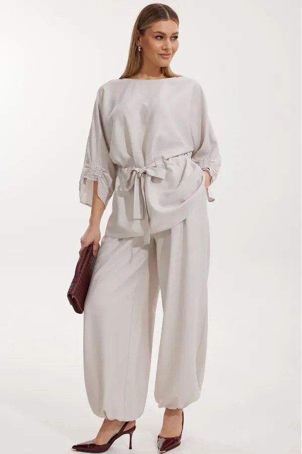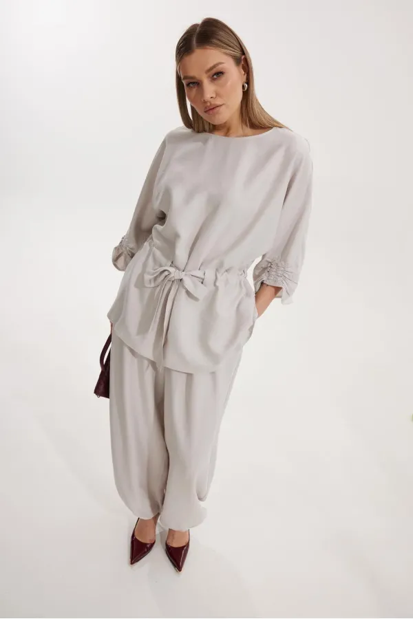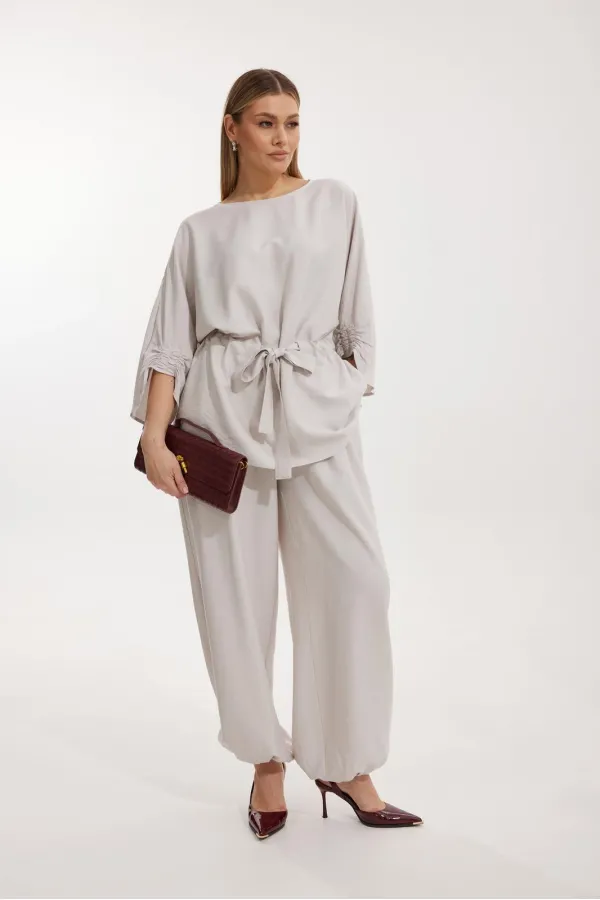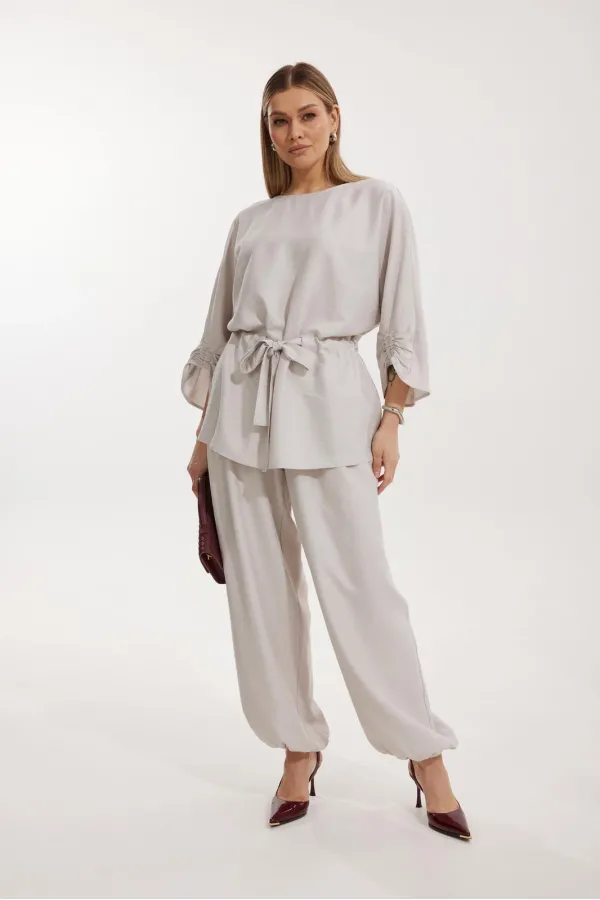 Костюм женский, состоящий из блузы и брюк. Блуза кроя «летучая мышь» длиной за линию бедра. Перед цельный с округлой горловиной. Спинка со средним швом. В районе талии обработана кулиса с широким поясом. По низу рукава по передней части выполнено несколько рядов сборки. Горловина обработана окантовкой. Брюки прямого силуэта с поясом на резинке. По передним половинкам заложены складки и обработаны наклонные карманы с отрезным бочком По низу брюки собраны на резинку. Верхний срез брюк обработан отрезным поясом на частичной резинке.
