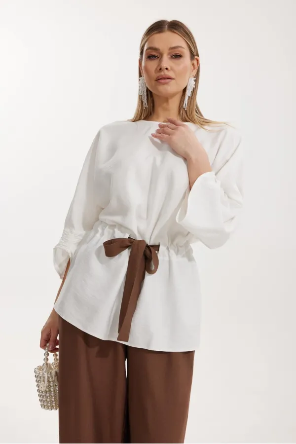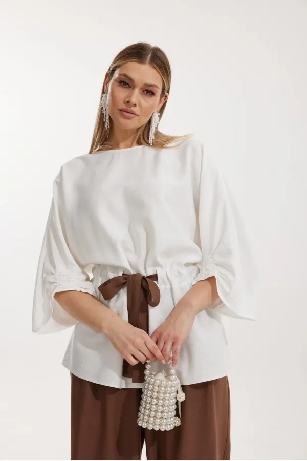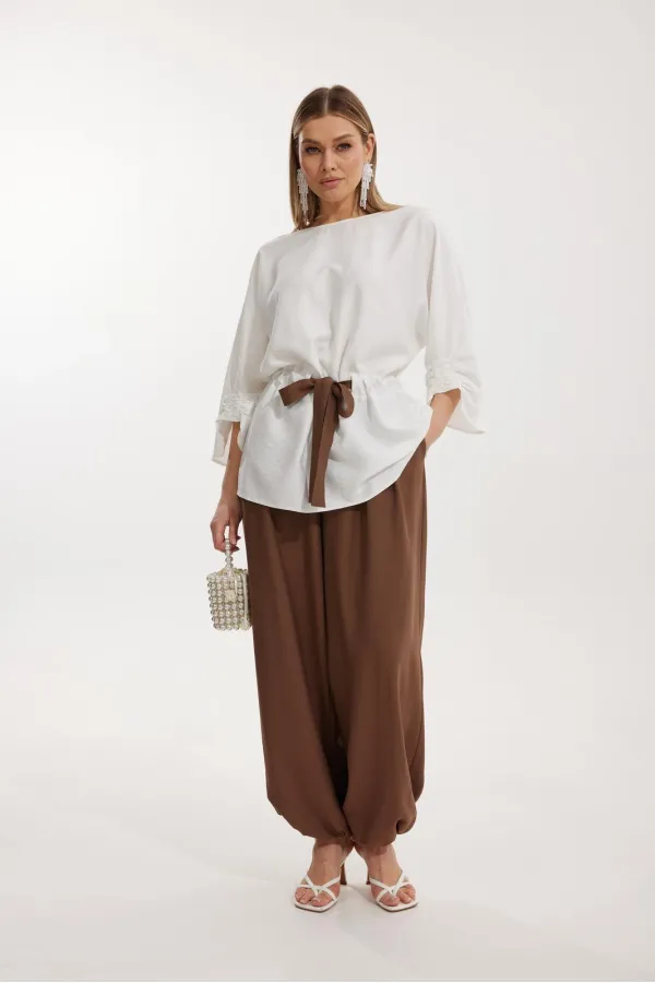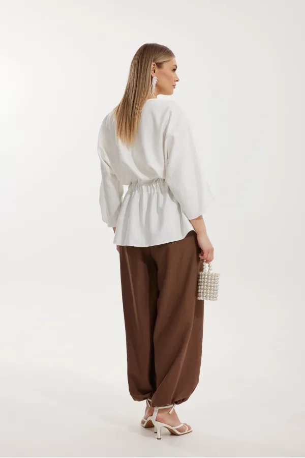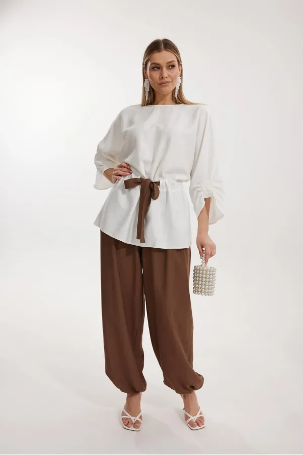 Костюм женский, состоящий из блузы и брюк. Блуза кроя «летучая мышь» длиной за линию бедра. Перед цельный с округлой горловиной. Спинка со средним швом. В районе талии обработана кулиса с широким контрастным поясом. По низу рукава по передней части выполнено несколько рядов сборки. Горловина обработана окантовкой. Брюки контрастного цвета прямого силуэта с поясом на резинке. По передним половинкам заложены складки и обработаны наклонные карманы с отрезным бочком По низу брюки собраны на резинку. Верхний срез брюк обработан отрезным поясом на частичной резинке.