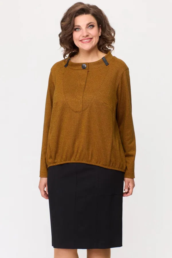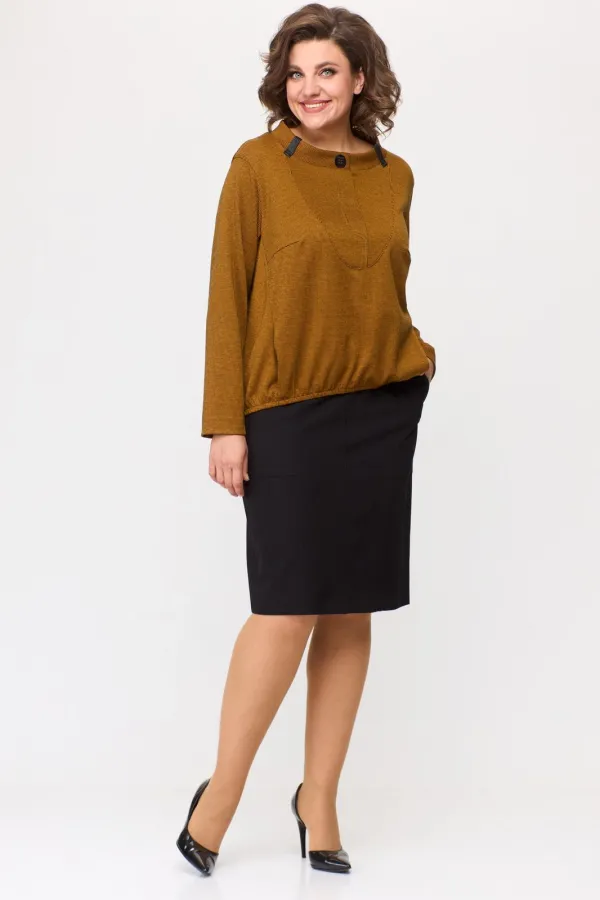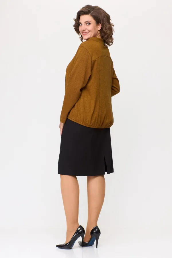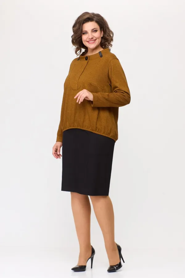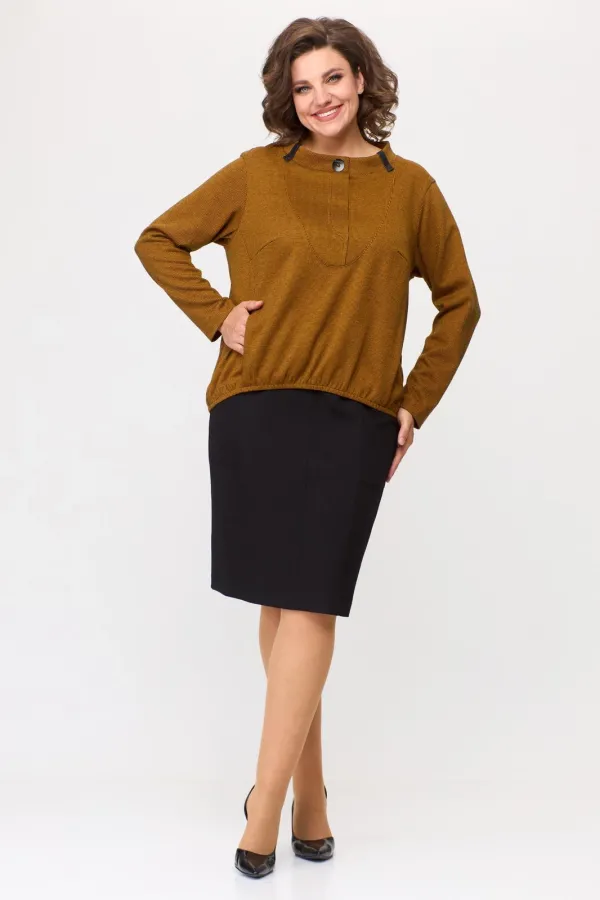 Комплект женский: джемпер и юбка. Джемпер свободного покроя из трикотажного полотна с фигурным низом на эластичную тесьму. По горловине стойка с декоративными шлевками из отделочной ткани. По полочке фигурный подрез, рельефы с внутренними карманами.