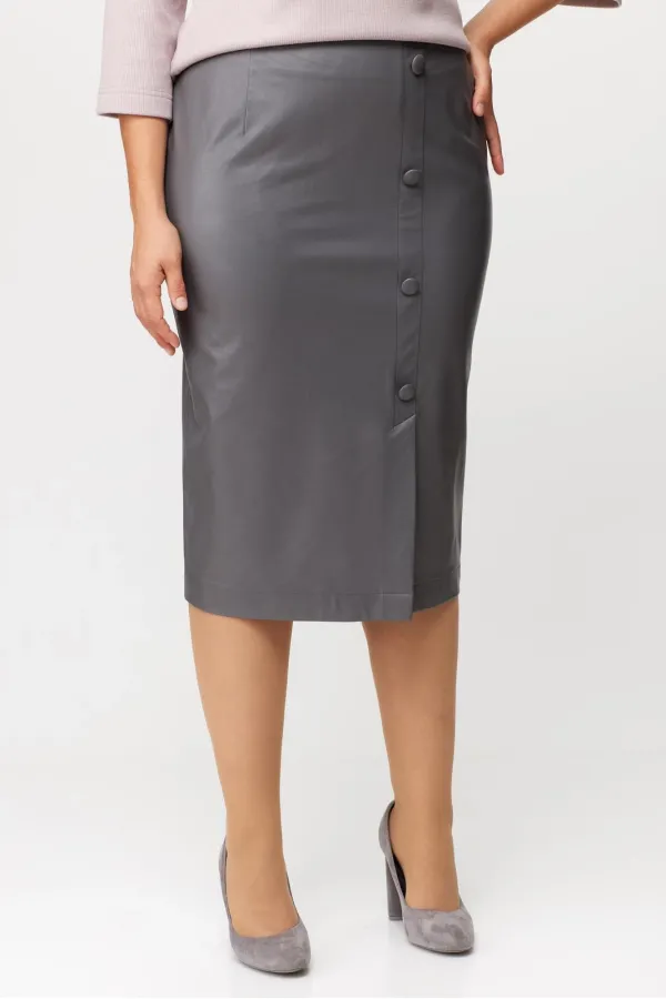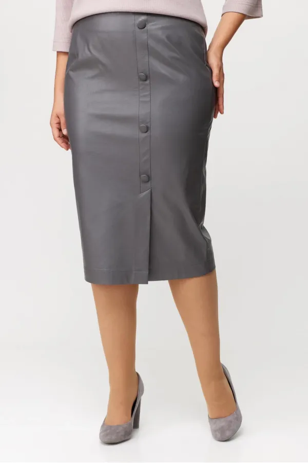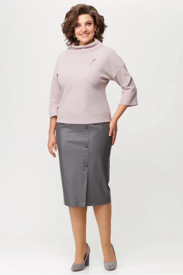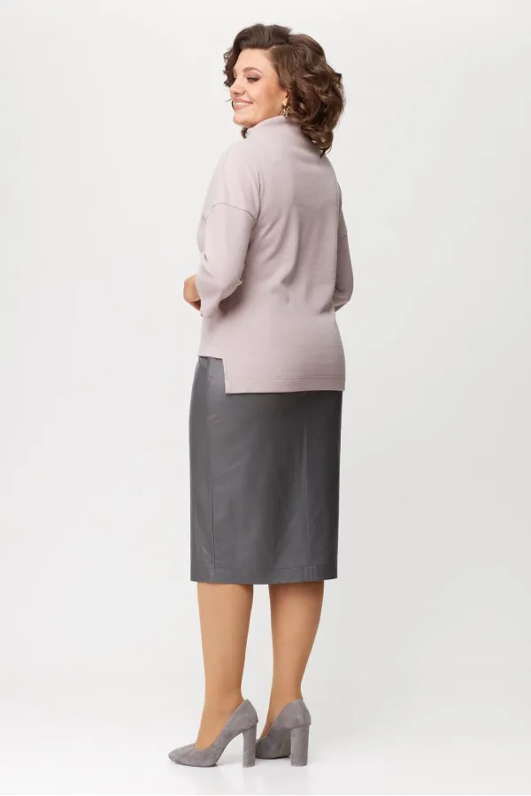 Комплект женский 2ух предметный (джемпер, юбка). Джемпер прямого силуэта со спущенной линией плеча и цельнокроеной стойкой. Рукав одно шовный с широкой подгибкой. Низ джемпера фигурный перед короче, спинка длиннее. Юбка из экокожи прямого силуэта на подкладке , пояс на обтачке. Спереди имитация застежки, разрез оформлен шлицей. Застежка молния. Длина юбки 71 см, длина джемпера по спинке 71см, длина рукава 37 см