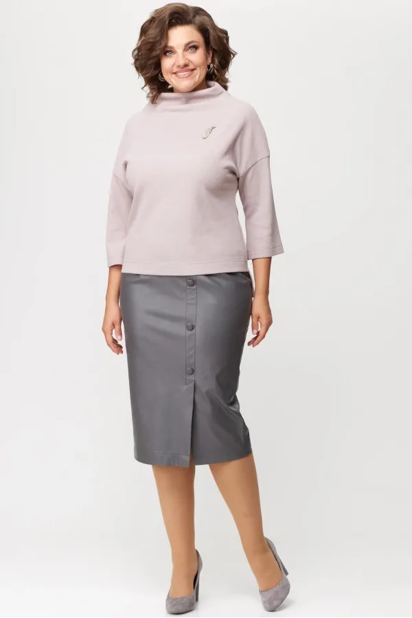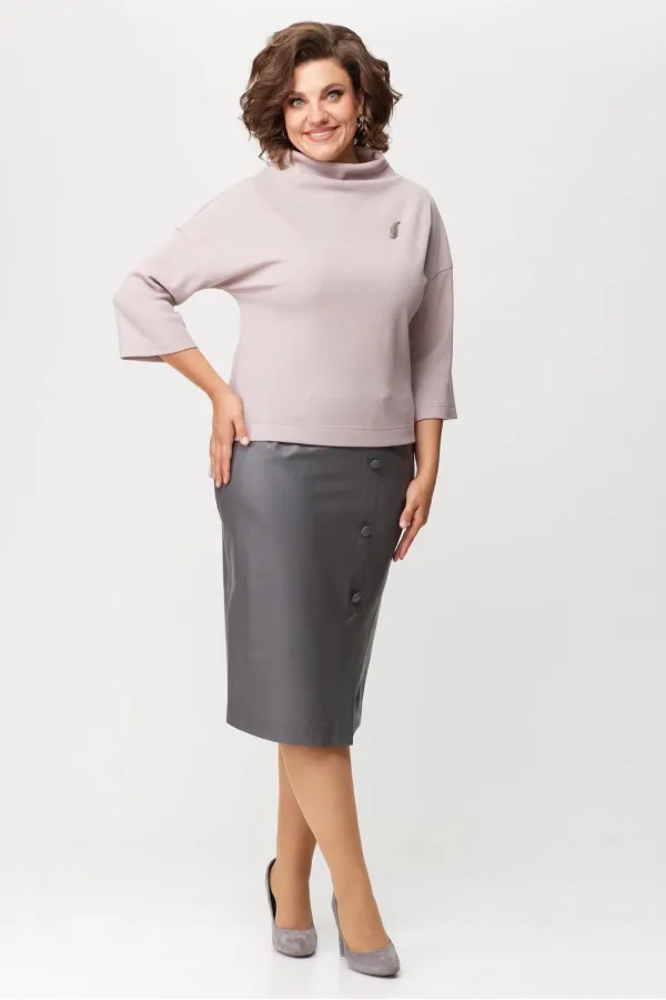 Комплект женский 2ух предметный (джемпер, юбка). Джемпер прямого силуэта со спущенной линией плеча и цельнокроеной стойкой. Рукав одно шовный с широкой подгибкой. Низ джемпера фигурный перед короче, спинка длиннее. Юбка ... Читать далее...