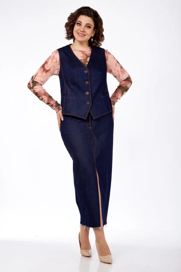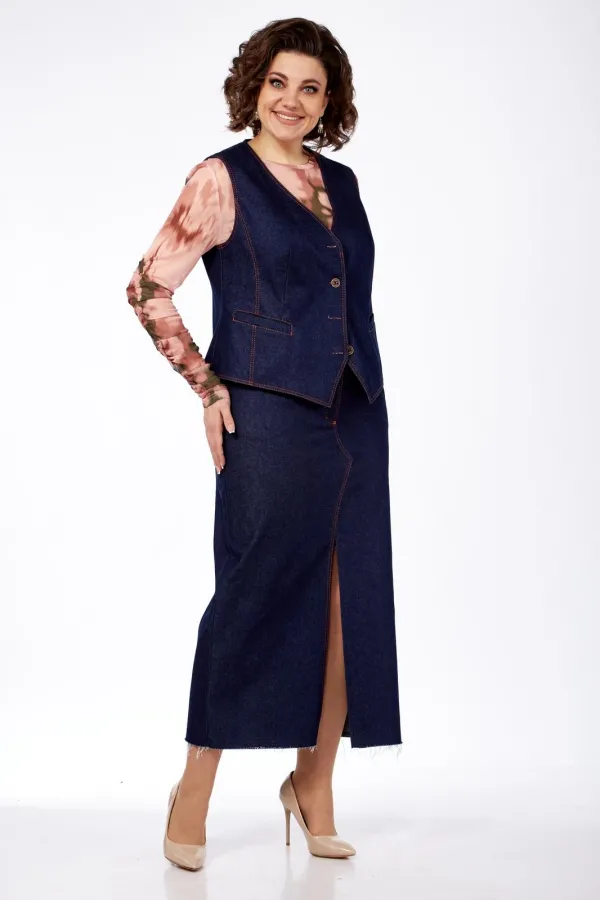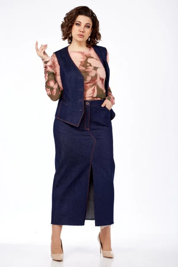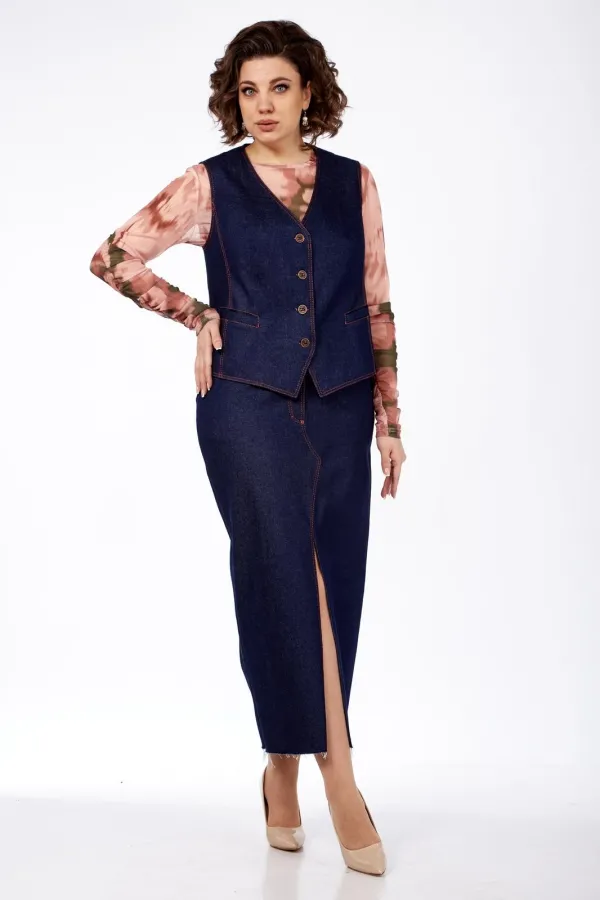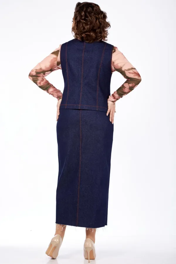 Комплект, состоящий из жилета , топа и юбки. Жилет полуприлегающего силуэта с застежкой на пуговицы, юбка-макси, силуэт прямой. Пояс притачной частично на резинке по бокам. Есть шлевки для ремня. Застёжка классическая гульфик, молния и пробивная джинсовая пуговица. По переду 2 боковых кармана и высокий фигурный разрез. По карманам, гульфику и разрезу прострочена двойная отделочная строчка контрастного цвета. Низ юбки не обработан, закреплён отделочной строчкой в цвет основной ткани. По заднему полотнищу юбки фигурная кокетка и средний шов, прострочены отделочные строчки.