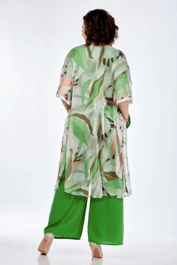 Комплект тройка: шазюбль, топ и брюки. Шазюбль из шифона, со спущенным плечом без застежки. По бокам разрезы. Топ с округлым вырезом горловины и спущенным плечом. Брюки свободного кроя, с карманами в боковых швах, пояс на резинке. Длина шазюбля 112 см, длина топа 57 см, длина брюк 102 см