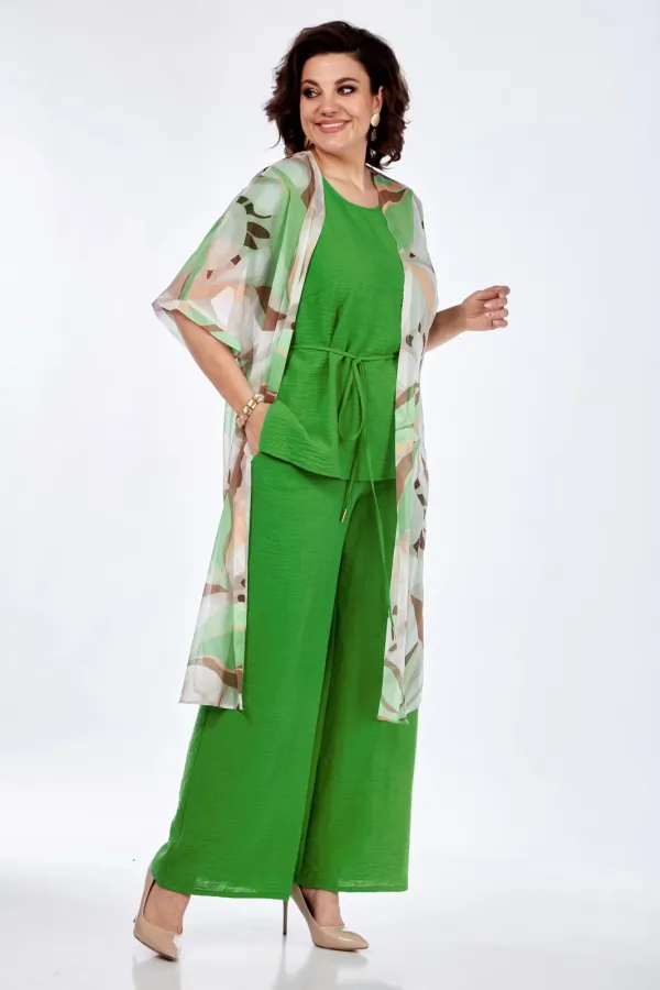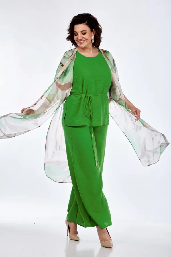 Комплект тройка: шазюбль, топ и брюки. Шазюбль из шифона, со спущенным плечом без застежки. По бокам разрезы. Топ с округлым вырезом горловины и спущенным плечом. Брюки свободного кроя, с карманами в боковых швах, пояс н... Читать далее...