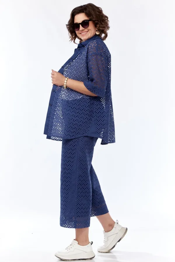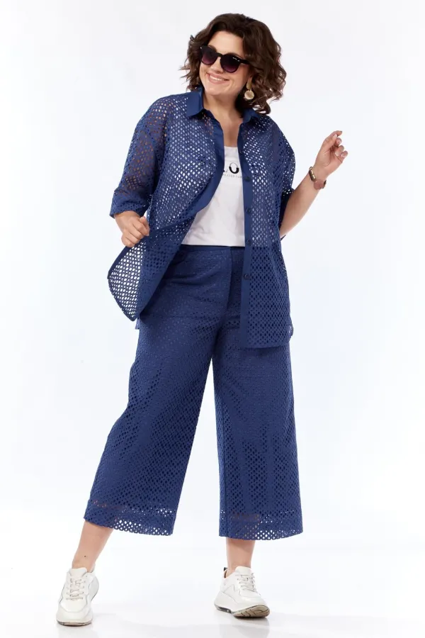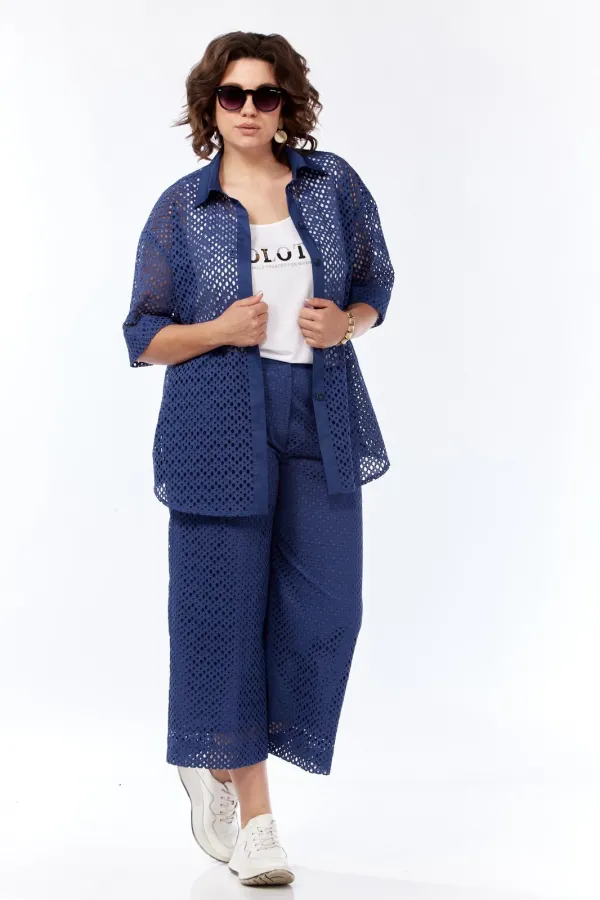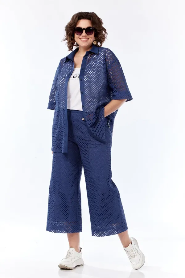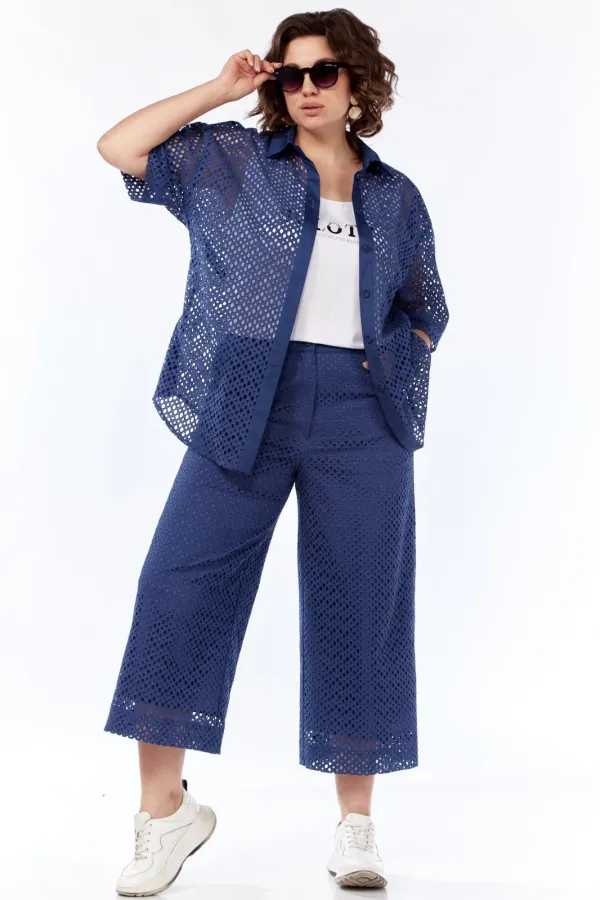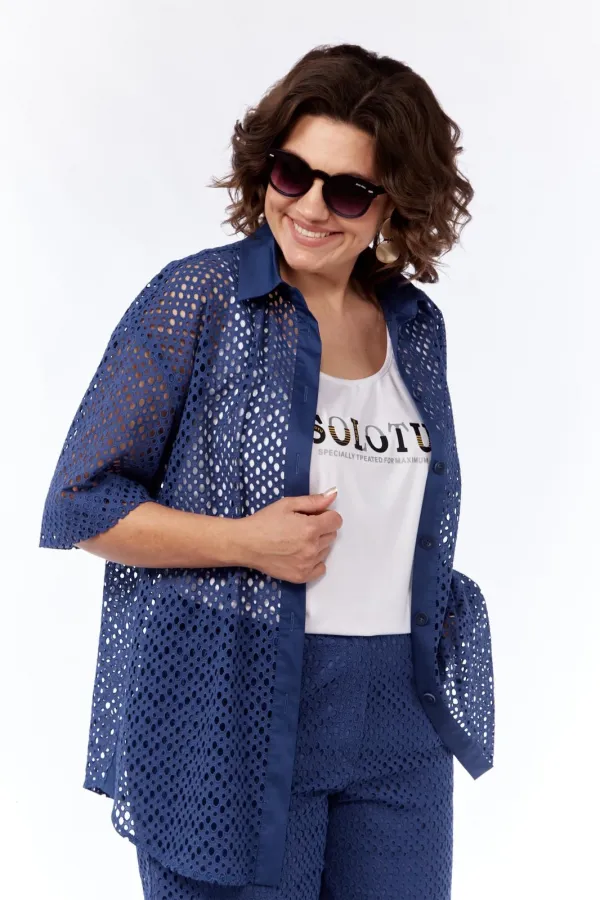 Комплект: рубашка, топ, брюки Рубашка свободного силуэта, воротник рубашечный на стойке, застёжка классическая на петли и пуговицы. Линия рукава спущена, длина рукава до локтя. Топ без рукава, силуэт прямой. По переду те... Читать далее...