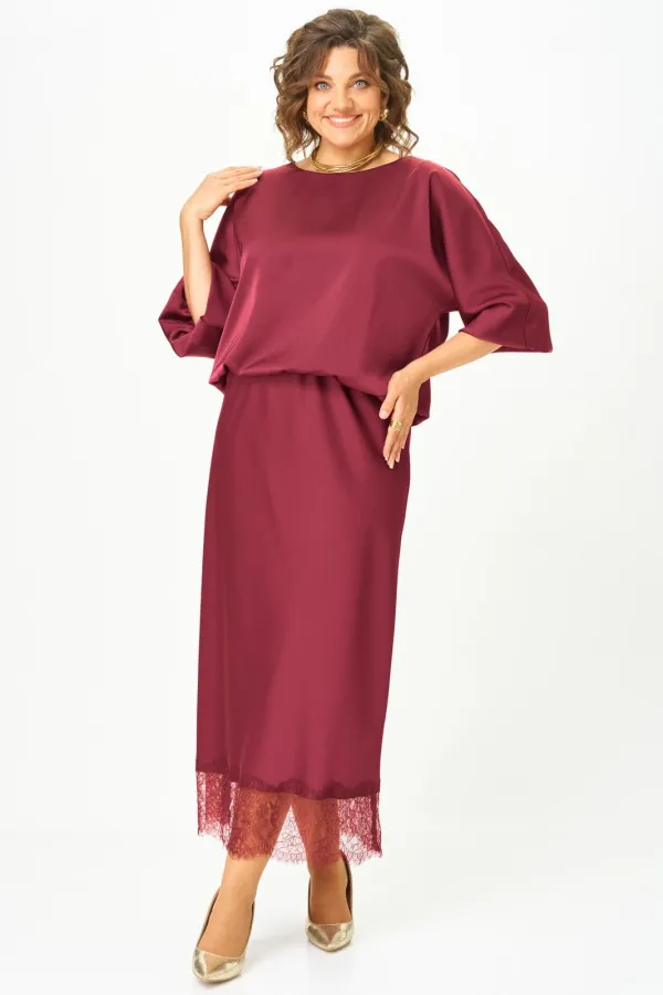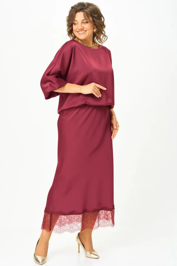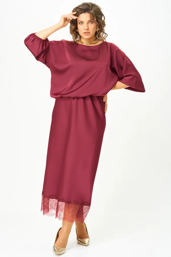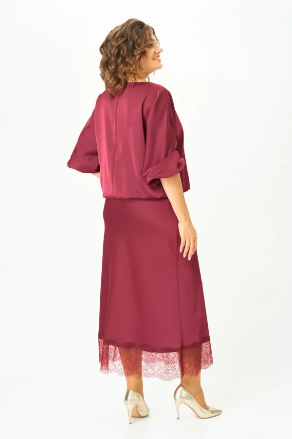 Костюм двойка, состоящий из блузы и юбки. Блуза с округлым вырезом горловины, рукав цельнокроеный. Низ блузы собран на резинке. Юбка расширенная к низу на резинке. По низу декор в виде кружева.