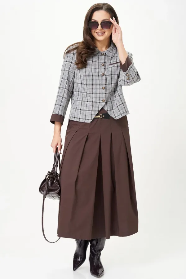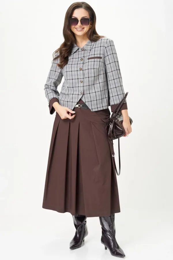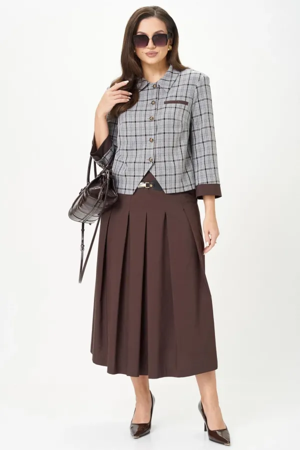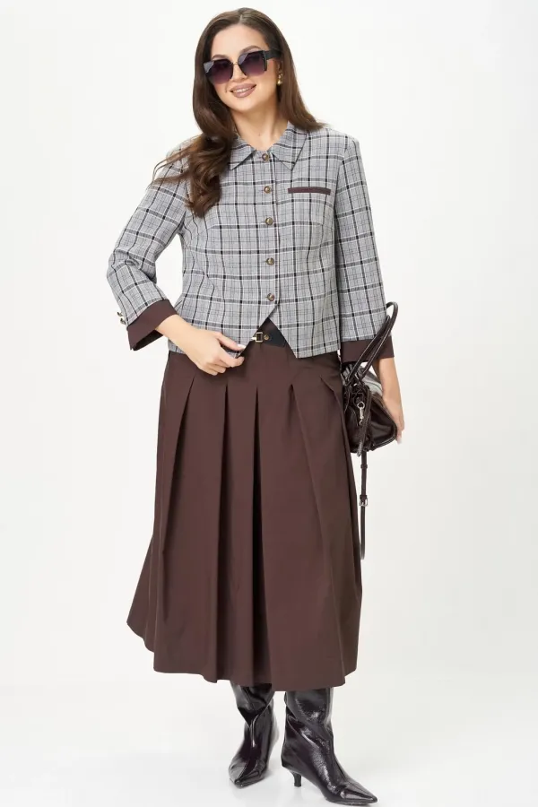 Комплект: жакет,юбка. Жакет полуприталенный без подкладки,воротник классический, рукав втачной, внизу притачная манжета. По переду листочка. Юбка на обтачке со складками.... Читать далее...