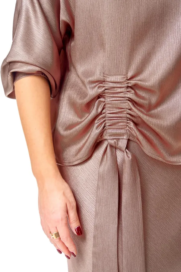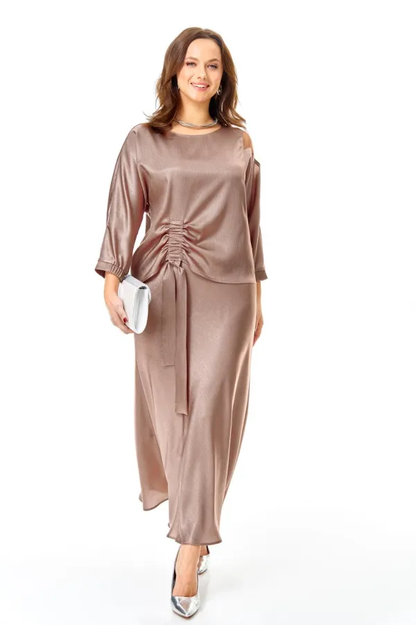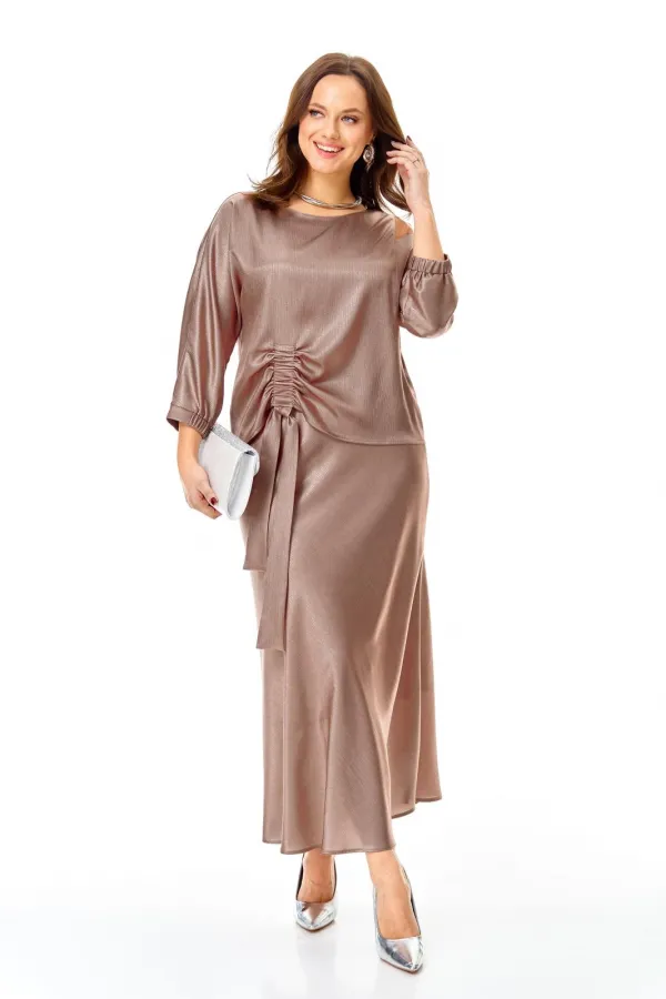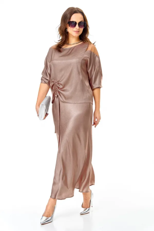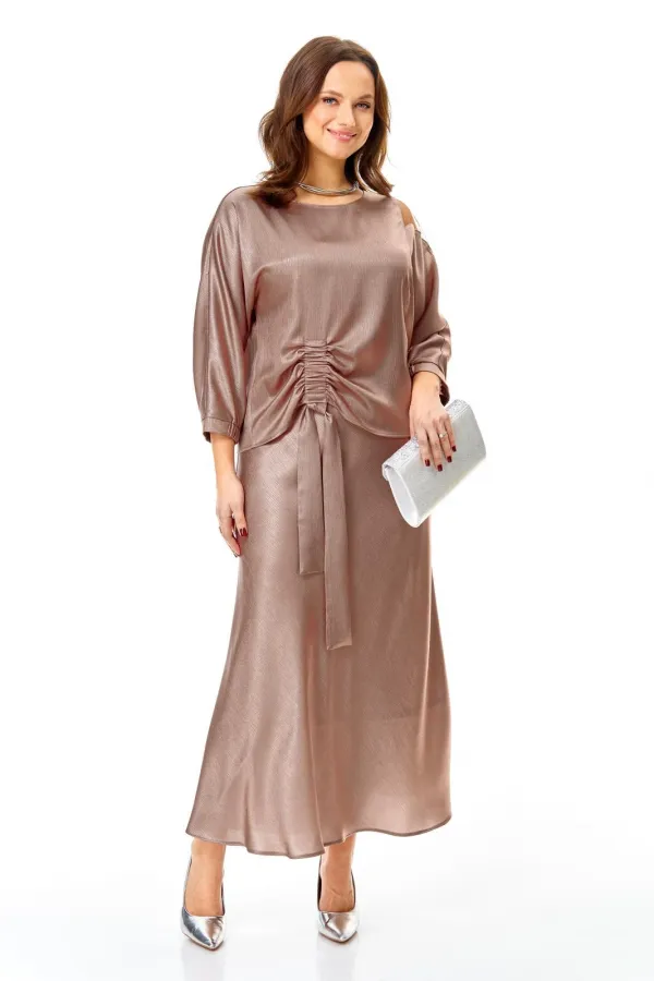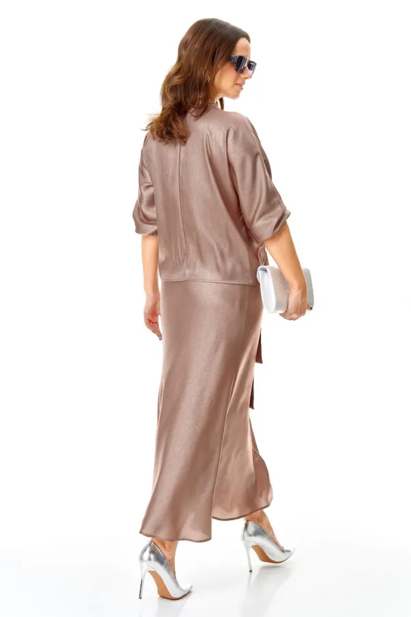 Костюм выполнен из мягкой струящееся ткани с необычной фактурой и матовым блеском.