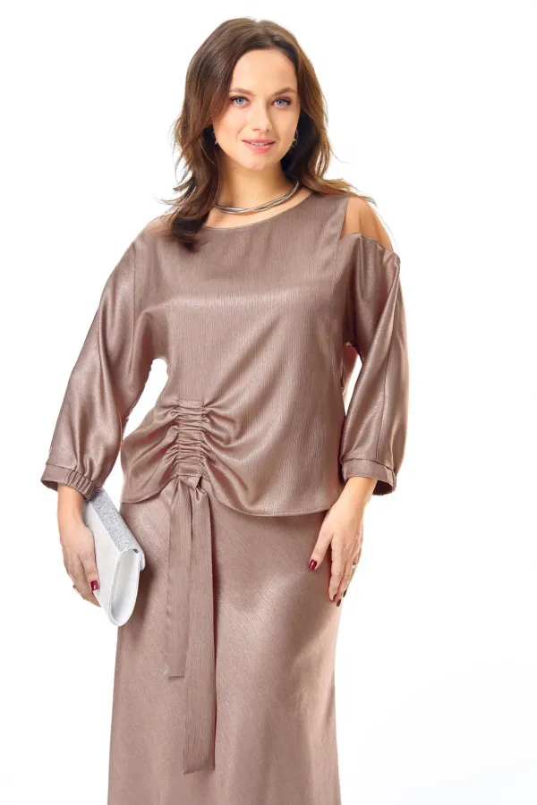 Костюм нарядный, состоит из блузона и юбки.Костюм выполнен из мягкой струящееся ткани с необычной фактурой и матовым блеском.Блузон прямого силуэта, линия плеча спущена, в левой части рукава вставлен элемент из тонкой пр... Читать далее...